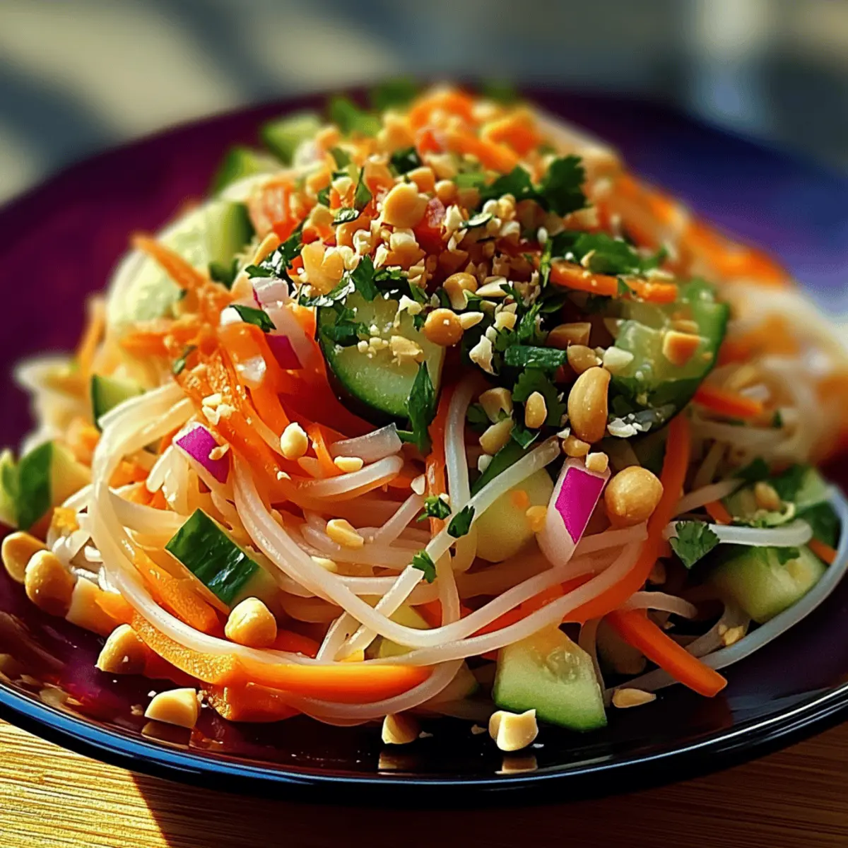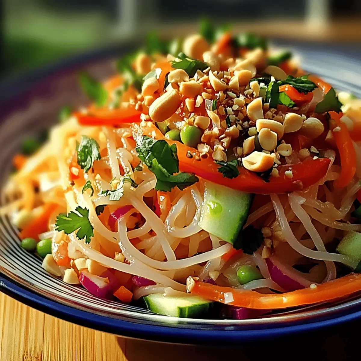 As I flipped through a vibrant cookbook filled with colors and flavors, one dish caught my eye—a refreshing Asian Noodle Salad with Ginger-Lime Dressing. It’s amazing how a simple combination of tender rice noodles and fresh vegetables can become a culinary delight that brightens any meal! This salad not only packs a satisfying crunch but also whisks you away to sunny days with its zesty, uplifting dressing. Perfect for quick lunches or as a light dinner, it is a breeze to customize for any dietary preference—vegan and gluten-free options are easily available. So, are you ready to whip up a bowl of this delicious salad that’s sure to impress? Let’s dive into the recipe! Why does this Asian Noodle Salad shine? Bright, Fresh Ingredients: The colorful vegetables not only enhance the visual appeal but also provide an array of nutrients, making this dish as healthy as it is delicious. Easy Customization: Perfect for all dietary preferences, simply swap ingredients to create a vegan or gluten-free delight. Add tofu for protein or experiment with seasonal veggies. Quick & Convenient: Ready in just 20 minutes, it’s an ideal solution for busy days or last-minute gatherings. Serve it alone or alongside dishes like Schnitzel Herb Salad. Zesty Flavor Explosion: The ginger-lime dressing is a refreshing twist that elevates the salad into a flavorful experience, making each bite a burst of brightness. Crowd-Pleasing Dish: Whether it’s a summer BBQ or a weekday lunch, this salad is bound to impress your family and friends, making it a staple in your recipe rotation. Asian Noodle Salad Ingredients For the Salad Base • Rice Noodles – These provide a tender yet chewy texture for the salad; be sure to cook them just until tender. • Cucumbers – Fresh and crunchy, they add a delightful crispness; consider alternatives like bell peppers for extra sweetness. • Bell Peppers – Offering vibrant color and crunch, they pair perfectly with the noodles and dressing. • Carrots – Adds natural sweetness and beautiful color; shredded carrots blend seamlessly throughout the dish. • Green Onions – A splash of mild onion flavor; use both white and green parts for added taste. • Fresh Cilantro and Mint – These herbs provide a fragrant freshness; adjust amounts based on your preference or skip them if you’re not a fan. For the Dressing • Fresh Grated Ginger – Adds aromatic warmth and a zingy kick; if needed, you can use ground ginger as a substitute. • Lime Juice – Bright and zesty, it enhances the dressing with acidity; always use fresh lime for the best flavor. • Soy Sauce – Brings a savory umami quality; for gluten-free options, opt for tamari. • Honey or Maple Syrup – Adds sweetness to balance the tangy dressing; use maple syrup to keep the dish vegan. • Sesame Oil – Infuses a rich, nutty flavor; this is optional but adds to the dressing’s complexity. For the Topping • Crushed Peanuts – Adds a crunchy finish and delightful nuttiness; if nut-free, sunflower seeds can be a tasty alternative. This Asian Noodle Salad with Ginger-Lime Dressing is bursting with flavor and color, turning any meal into an exciting culinary experience! Step‑by‑Step Instructions for Asian Noodle Salad with Ginger-Lime Dressing Step 1: Cook the Noodles Begin by boiling water in a large pot over high heat. Once boiling, add the rice noodles and cook according to package instructions, usually about 4-6 minutes until just tender. Drain them in a colander and rinse under cold water to stop the cooking process and prevent sticking. Set the noodles aside to cool while you prepare the dressing. Step 2: Make the Dressing In a small bowl, combine fresh grated ginger, lime juice, soy sauce, and honey or maple syrup. Whisk these ingredients together until well blended and smooth, allowing the flavors to meld. Taste the dressing and adjust sweetness or acidity to your liking, keeping in mind this is the star of your Asian Noodle Salad with Ginger-Lime Dressing. Step 3: Prepare Vegetables Slice cucumbers and bell peppers thinly, making sure to create uniform pieces for an appealing presentation. Grate the carrots using a box grater or a food processor for convenience. Chop green onions, cilantro, and mint, adding these aromatic herbs to your vegetable mix. These vibrant veggies will provide the necessary crunch and freshness to the salad. Step 4: Combine Ingredients In a large mixing bowl, combine the cooled rice noodles with the sliced vegetables and herbs you’ve prepared. Gently toss everything together to ensure even distribution. Drizzle the zesty ginger-lime dressing over the top, and toss again until all ingredients are thoroughly coated and well mixed, creating a delightful Asian Noodle Salad. Step 5: Serve and Garnish To finish your salad, transfer it to a serving platter or individual bowls. Top with crushed peanuts for an added crunch, as well as additional chopped herbs if desired. This Asian Noodle Salad with Ginger-Lime Dressing is best served immediately or can be chilled for a short time to enhance the flavors before enjoying. Expert Tips for Asian Noodle Salad Flavor Infusion: Allow the salad to rest for at least 10 minutes before serving; this gives the flavors time to meld beautifully. Watch the Noodles: Overcooking the rice noodles leads to a mushy texture. Keep a close eye on them, and rinse under cold water immediately after cooking. Dressing Balance: Taste the ginger-lime dressing before mixing; it should have a perfect balance of tanginess and sweetness, adjust as needed for your preference. Crunch Factor: For an extra crunch in your Asian Noodle Salad with Ginger-Lime Dressing, add fresh bean sprouts or replace peanuts with sunflower seeds for a nut-free option. Storage Tips: If saving leftovers, keep the dressing in a separate container to avoid soggy noodles, maintaining the salad’s delightful texture. How to Store and Freeze Asian Noodle Salad Fridge: Store leftov