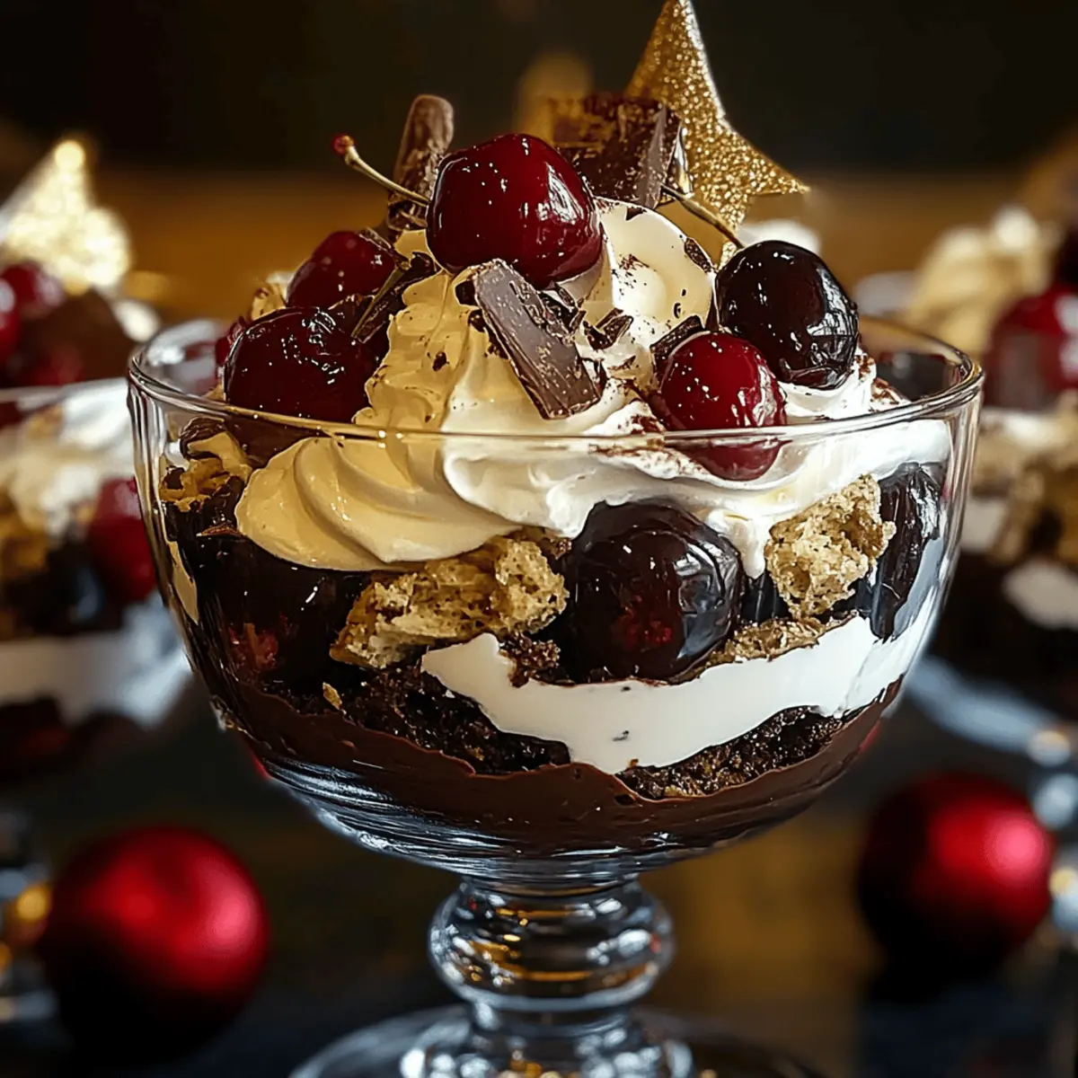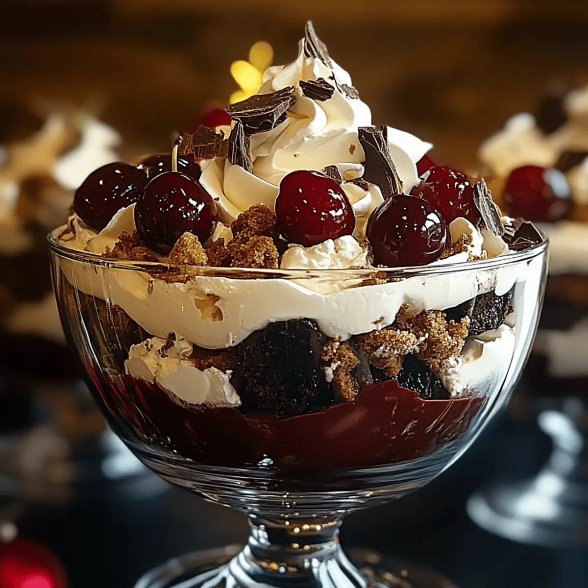 Delight in layers of chocolate cake, whipped cream, and cherries with this Black Forest Trifle, a perfect make-ahead dessert for festive gatherings.