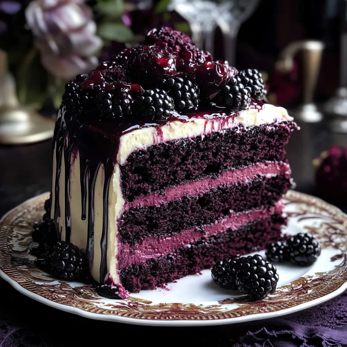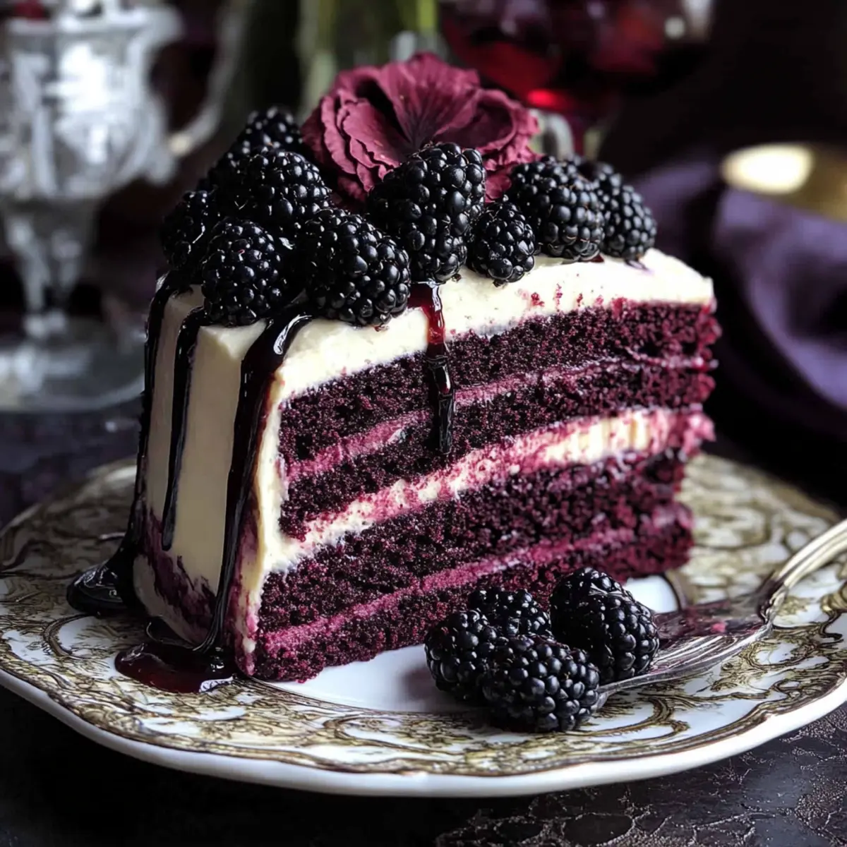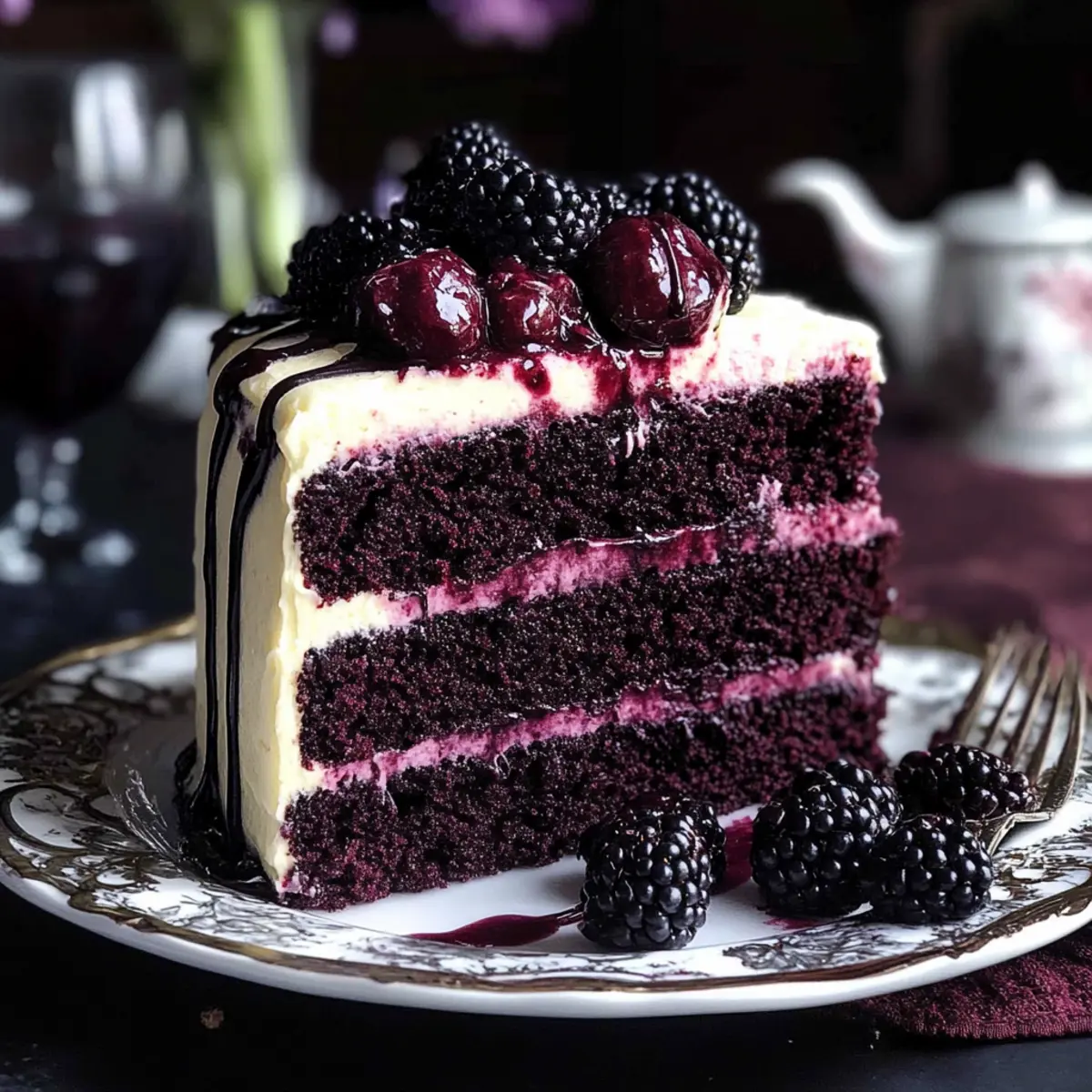 As I sifted through the dark cocoa powder, a phantom of flavor began to materialize. Allow me to introduce you to the enchanting Blackberry Velvet Gothic Cake—a striking dessert that’s not just about looks. With its luscious layers and the unexpected tang of blackberries, this cake effortlessly elevates any gathering into a delightful experience. Perfect for those crisp autumn nights or festive Halloween celebrations, it promises to dazzle and please with relatively quick prep and charming presentation. Whether you’re a seasoned home-chef or a curious novice tired of fast food, this captivating recipe is sure to redefine your dessert repertoire. Ready to create something eerily delicious? Let’s dive in! Why Is This Cake So Irresistible? Decadent Layers: Each slice of the Blackberry Velvet Gothic Cake is a sumptuous experience, with layers that are both moist and rich, perfectly balancing the sweet and tangy flavors of fresh blackberries. Eye-Catching Presentation: Its deep purple-black hue and creamy frosting make it an immediate conversation starter, ideal for Gothic-themed parties or Halloween gatherings. Versatile Recipe: Whether you’re following a gluten-free or vegan diet, this cake easily adapts to your needs. For more delightful creations, check out my Savory Cabbage Pancakes or indulge in a slice of Coffee Cheesecake Indulge. Quick and Simple: Despite its eye-catching allure, the baking process is straightforward—perfect for both seasoned bakers and new enthusiasts alike. Perfect for Any Occasion: Serve it as a show-stopping dessert at your next gathering or simply enjoy a slice with your afternoon coffee; it fits seamlessly into any event. Blackberry Velvet Gothic Cake Ingredients Let’s gather the enchanting ingredients for this delightful dessert! For the Cake All-Purpose Flour – Provides structure and stability to the cake. Note: For a gluten-free option, substitute with a suitable gluten-free flour blend. Unsweetened Dark Cocoa Powder – Adds depth of flavor and a rich color. Note: Use the best quality for enhanced chocolate taste and avoid overly sweetened cocoa. Baking Soda – Acts as a leavening agent for a light, airy texture. Note: Ensure it’s fresh for optimal rise. Salt – Enhances the sweetness and balances flavors. Note: Use fine sea salt for easy incorporation. Buttermilk – Contributes moisture and tenderness, enhancing the velvet texture. Substitution: Use milk mixed with a bit of vinegar or lemon juice. Blackberry Purée – Provides flavor and color; adds a tartness. Note: Use fresh for vibrant flavor, but frozen can work if drained properly. Lemon Juice or Vinegar – Increases cake tenderness and acidity to react with baking soda. Note: Either works; choose lemon for a hint of additional flavor. Granulated Sugar – Sweetens the cake and aids in achieving its sponge-like texture. Note: Do not substitute with brown sugar for desired texture. Vegetable Oil – Keeps the cake moist and tender. Note: Can swap with melted coconut oil for a different flavor palette. Eggs – Binds the ingredients and adds richness and moisture. Note: For a vegan option, use flaxseed eggs or unflavored apple sauce. Vanilla Extract – Imparts flavor and enhances overall taste profile. Note: Use pure vanilla for the best flavor compared to imitation. For the Frosting Cream Cheese – Forms the base for the frosting, providing creaminess and tang. Substitution: Use vegan cream cheese for a dairy-free option. Unsalted Butter – Smooths the frosting and provides creaminess. Note: To make it plant-based, substitute with vegan butter. Powdered Sugar – Sweetens and firms the frosting. Tip: Sift for a smooth frosting texture. For Decoration Garnishes (Fresh Blackberries, Edible Flowers, Blackberry Glaze or Dark Chocolate Shards) – Enhance decoration and flavor. Note: Use fresh edible flowers to accentuate the gothic theme. Step‑by‑Step Instructions for Blackberry Velvet Gothic Cake Step 1: Preheat the Oven Begin by preheating your oven to 350°F (175°C). While it’s heating, grab two 9-inch round cake pans and grease them well with butter or non-stick spray. For an extra measure, line the bottoms with parchment paper to ensure your Blackberry Velvet Gothic Cake easily releases after baking. Step 2: Prepare Dry Ingredients In a large mixing bowl, sift together 2 cups of all-purpose flour, ¾ cup of unsweetened dark cocoa powder, 1 teaspoon of baking soda, and ½ teaspoon of salt. Sifting helps aerate the mixture, giving your cake a light texture. Set this bowl aside while you work on the wet ingredients that will bring your cake to life. Step 3: Prepare Wet Ingredients In a separate bowl, whisk together 1 cup of buttermilk, ½ cup of blackberry purée, 1 tablespoon of lemon juice, and 1 teaspoon of pure vanilla extract until fully combined. This delightful mixture will add moisture and the signature berry flavor to your Blackberry Velvet Gothic Cake, so make sure it’s smooth and well-blended before moving on to the next step. Step 4: Mix the Batter In a mixing bowl, combine 1 cup of granulated sugar and ½ cup of vegetable oil, beating them together until creamy. Next, add 2 eggs one at a time, mixing well after each addition. Gradually alternate between adding the dry mixture and the wet ingredients to the sugar mixture, stirring gently until just combined—be careful not to overmix, as this can lead to a dense cake. Step 5: Bake the Cake Divide the batter evenly between the two prepared pans, smoothing the tops with a spatula. Place them in the preheated oven and bake for 30–35 minutes, until a toothpick inserted in the center comes out clean. Once baked, set the pans on a wire rack to cool for about 10 minutes before carefully removing the cakes from the pans to cool completely. Step 6: Prepare the Frosting In a mixing bowl, beat together 8 ounces of softened cream cheese and ½ cup of unsalted butter until the mixture is fluffy and smooth. Gradually a