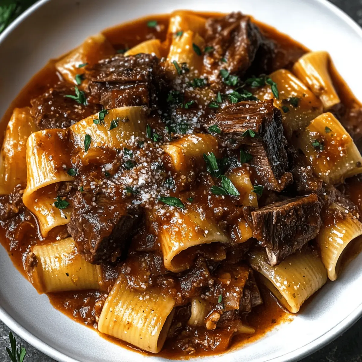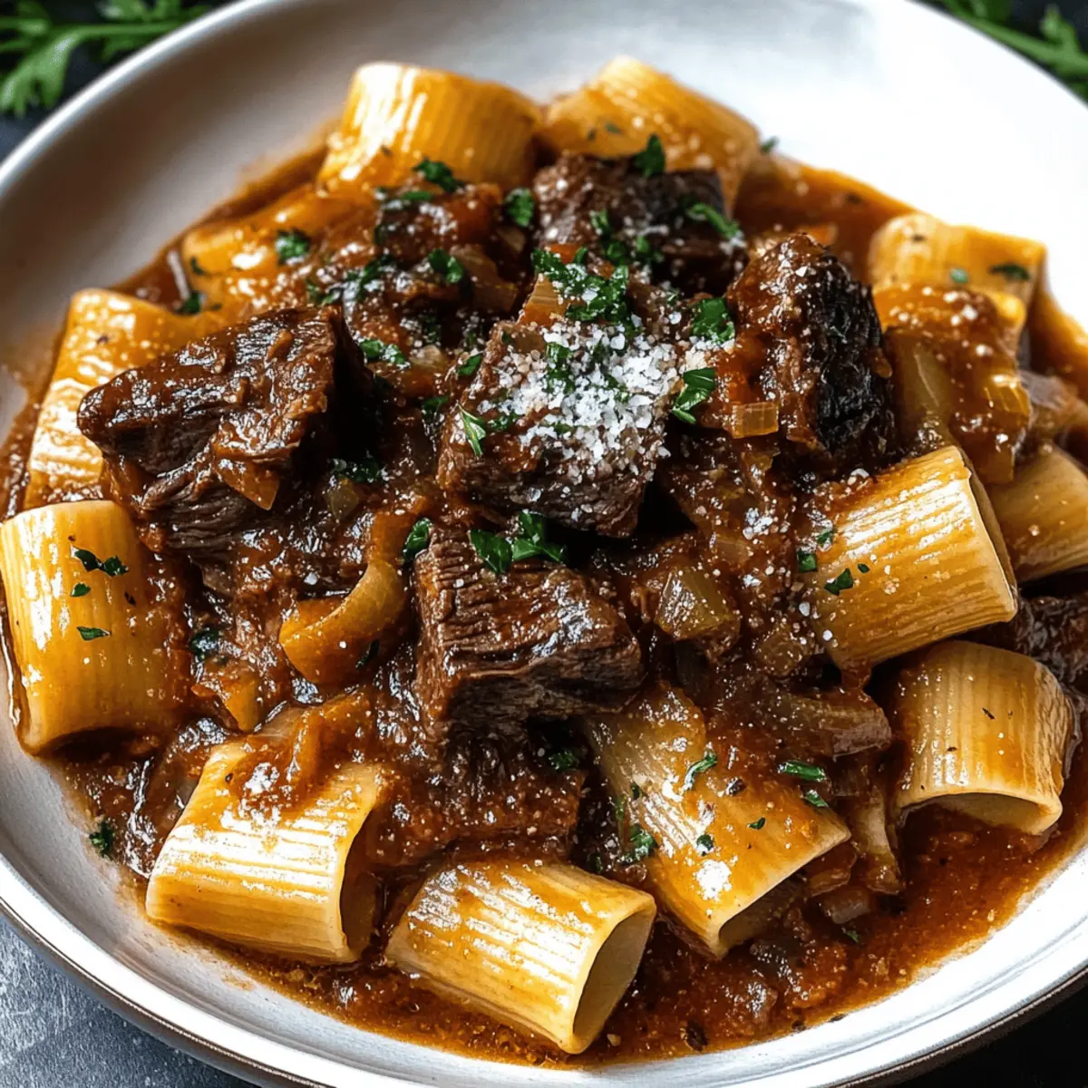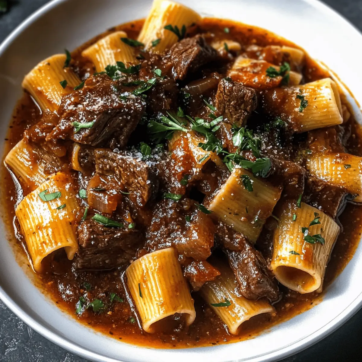As I stirred the simmering pot of Braised Short Rib Ragu Pasta, a wave of nostalgia washed over me. This dish, with its meltingly tender beef and luscious sauce, has a magical way of bringing everyone together. Whether it’s a chilly evening at home or a festive gathering with friends, this hearty comfort food classic easily wins hearts. With its rich flavors and satisfying texture, it’s a high-protein delight that’s perfect for those who love culinary adventures but crave the warmth of home-cooked meals. Plus, it can be prepped in advance and stored, making it a fantastic option for busy days. Are you ready to embark on this savory journey with me? Why is Braised Short Rib Ragu Pasta a must-try? Comforting and Satisfying: This dish wraps you in warmth with its rich, hearty flavors, perfect for cozy nights. Effortless Preparation: It may seem gourmet, but this recipe is straightforward—even home cooks will shine! Crowd-Pleasing Delight: Impress family and friends with a meal worthy of celebration; it’s a guaranteed hit at gatherings. Meal Prep Friendly: Make it ahead and store it for busy weeknights—simply reheat for a delicious dinner! Nutritionally Balanced: Packed with protein and wholesome ingredients, it’s a dish you can feel good about serving. For more comforting recipes, check out my Braised Beef Short and Bruschetta Chicken Pasta recipes! Braised Short Rib Ragu Pasta Ingredients For the Ragu Beef short ribs – The star of the dish, they give the ragu a rich flavor and indulging tenderness; beef chuck can be a good alternative but will require a different cooking time. Olive oil – Essential for browning the meat and sautéing the vegetables; if you’re out of olive oil, vegetable oil works too! Onion – Builds a wonderful aromatic base for the sauce; feel free to use any onion variety you have on hand. Carrots – Adds natural sweetness and vibrant color; parsnips can be used for a different flavor twist. Celery – A classic component of mirepoix, it brightens the sauce; you can choose to omit it if desired. Garlic – Amplifies savory flavors and brings lovely aroma to the dish; fresh garlic is the best choice for this recipe. Red wine (Chianti) – Imparts depth and complexity to the ragu; any dry red wine that you enjoy will work beautifully as a substitute. Crushed tomatoes – Forms the tangy, flavorful base of the sauce; fresh tomatoes are an option if you have them, though they will require longer cooking. Beef broth – Enhances moisture and the overall taste; low-sodium chicken broth offers a lighter alternative. Tomato paste – Concentrates the tomato flavor and helps thicken the sauce; you can use extra crushed tomatoes if needed. Dried oregano and thyme – These herbs give your ragu deep, earthy notes; fresh herbs can be switched in for an even brighter flavor. Bay leaf – Adds a complex hint of flavor while cooking; be sure to remove it before serving. Salt and pepper – Essential for bringing out the flavors; don’t hesitate to adjust to your taste preferences. For the Pasta Pasta (pappardelle or tagliatelle) – Their broad shape captures the ragu perfectly; any long pasta will do in a pinch. Fresh parsley – Brightens the dish as a garnish; use basil for a fresh twist instead! Grated Parmesan cheese – The perfect salty finish to the ragu; for a dairy-free option, consider nutritional yeast. With these ingredients ready, you’re one step closer to savoring a plate of delicious Braised Short Rib Ragu Pasta that warms the heart and soul! Step‑by‑Step Instructions for Braised Short Rib Ragu Pasta Step 1: Brown the Short Ribs In a large Dutch oven, heat 2 tablespoons of olive oil over medium-high heat. Season the beef short ribs generously with salt and pepper, then add them to the hot pot. Sear the ribs for about 3-4 minutes on each side until they are deeply browned; this adds amazing flavor to your Braised Short Rib Ragu Pasta. Once browned, remove the ribs and set them aside. Step 2: Sauté Vegetables In the same pot, lower the heat to medium and add the chopped onion, carrots, and celery. Sauté these aromatic vegetables for 5-7 minutes until they soften and become fragrant, stirring occasionally. Add the minced garlic and continue to cook for another minute, allowing its rich aroma to fill the air, creating a wonderful base for your ragu. Step 3: Deglaze with Wine Pour in 1 cup of red wine, scraping up any browned bits stuck to the bottom of the pot with a wooden spoon. This deglazing step will take about 5-7 minutes as the wine simmers, reducing slightly and intensifying the flavors. Allow the alcohol to evaporate, leaving behind a rich essence that will deepen your Braised Short Rib Ragu Pasta sauce. Step 4: Build the Ragu Base Stir in the crushed tomatoes, beef broth, and tomato paste, followed by the dried oregano, thyme, and bay leaf. Combine everything thoroughly, then return the browned short ribs to the pot. The mixture should simmer together happily, offering a fragrant invitation to the meal you are creating, as it begins to transform into a luxurious ragu. Step 5: Braise the Ribs Cover the pot and reduce the heat to low, allowing the ragu to braise gently for 2.5 to 3 hours. You’re looking for the meat to become beautifully tender, falling off the bone easily. Make sure to check occasionally, giving it a gentle stir and ensuring the sauce doesn’t stick, as it develops rich flavors perfect for your Braised Short Rib Ragu Pasta. Step 6: Prepare the Pasta About 15 minutes before the ragu finishes cooking, bring a large pot of salted water to a boil. Add the pasta—like pappardelle or tagliatelle—and cook until al dente, according to package instructions, usually about 8-10 minutes. Reserve 1 cup of pasta water before draining the rest, as this will help you achieve the desired sauce consistency when combining everything. Step 7: Combine Pasta and Ragu Once the short ribs are tender, carefully remove them from the pot