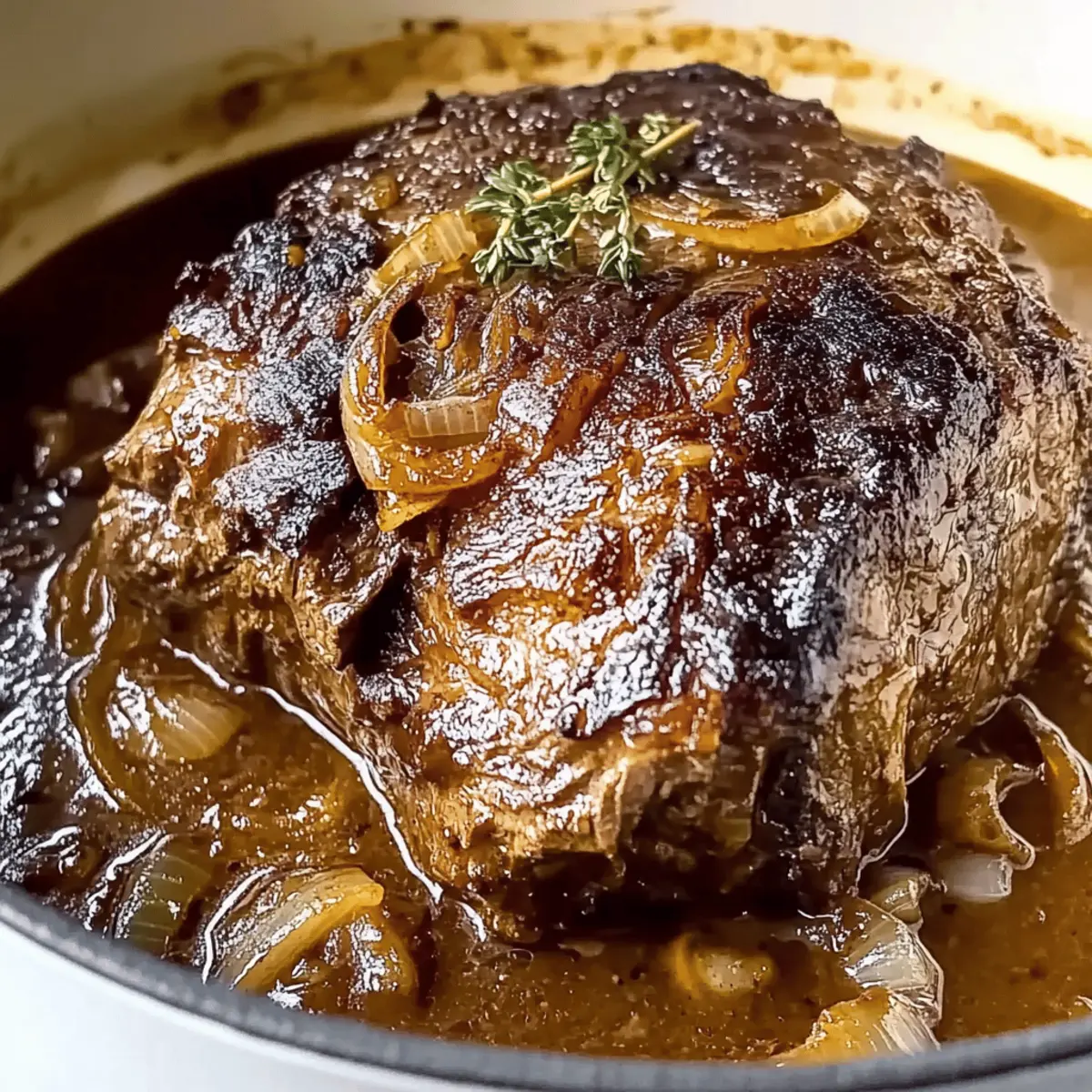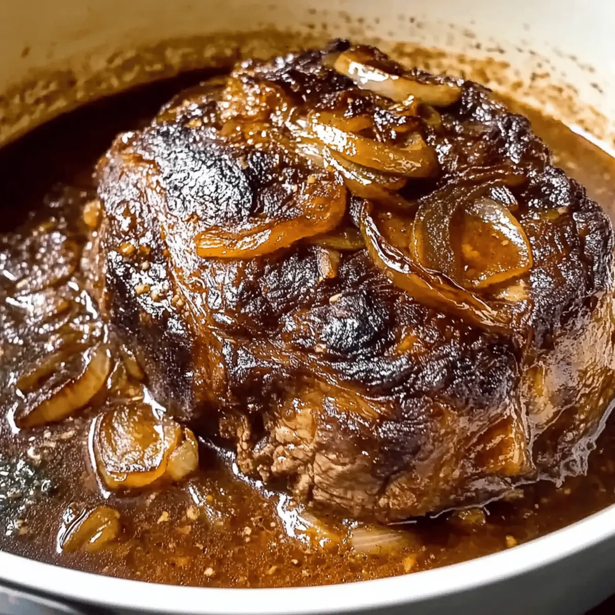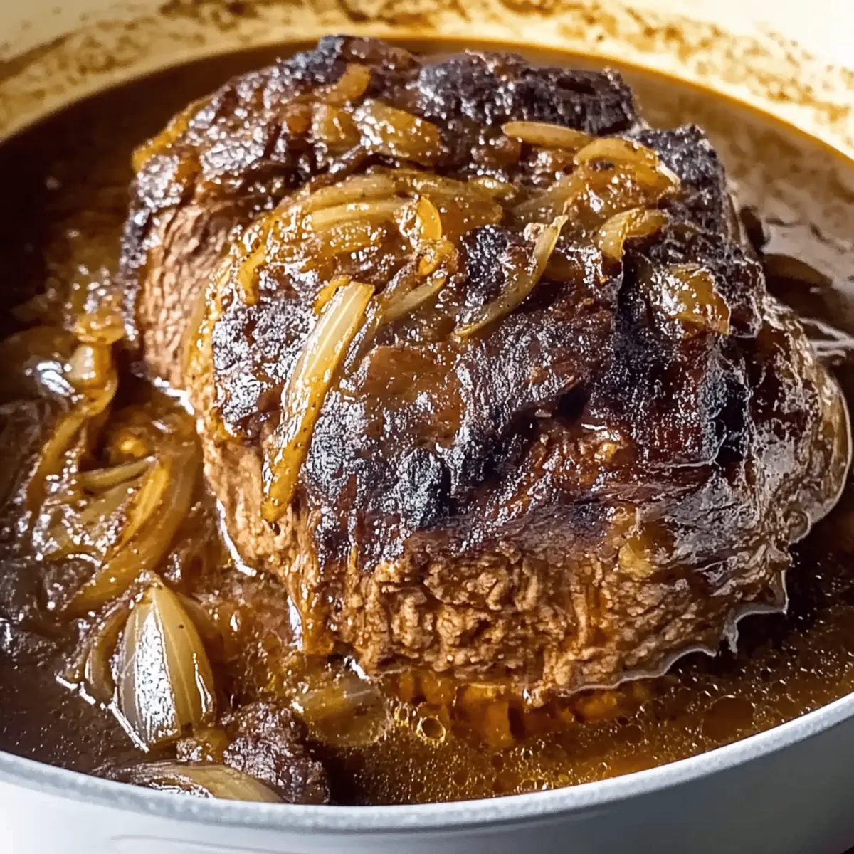 As the aroma of slowly braising beef wafted through my kitchen, I couldn’t help but feel a wave of comfort wash over me. This Comforting French Onion Pot Roast is my go-to, especially when the weather turns chilly or when I need a meal that brings the family together. The magic of this dish lies in its simplicity; it requires minimal hands-on time while imbuing the meat with the sweet richness of caramelized onions. To top it off, it makes a delightful meal ahead of time, ensuring you can enjoy precious moments with your loved ones rather than fussing in the kitchen. With each bite, you’ll discover tender chunks of beef bathed in a thick gravy that echoes classic French onion flavors, and trust me—this is one recipe you’ll want to keep close at hand. Are you ready to transform your kitchen into a comforting haven with this heartwarming dish? Why is this pot roast a must-try? Simplicity shines through with this one-pot dish that requires minimal preparation but delivers maximum flavor. Mouthwatering caramelized onions meld beautifully with tender beef, creating a savory gravy that’s utterly irresistible. Versatile enough for weeknight dinners or special occasions, it pairs wonderfully with creamy mashed potatoes or buttery polenta. Plus, it’s make-ahead friendly—perfect for busy lifestyles! If you love comforting meals like my Italian Pot Roast or enjoy a twist on classic flavors as seen in my Cheesy French Onion Meatballs, this recipe is a delicious addition to your repertoire. Comforting French Onion Pot Roast Ingredients • Get ready to create a family favorite! For the Pot Roast Chuck Roast – A 3 lb boneless chuck roast offers the ideal balance of flavor and tenderness. Fine Sea Salt – Enhances the savory profile of both the meat and caramelized onions; adjust to your taste. Freshly Ground Black Pepper – Provides warmth and depth; freshly ground is best for flavor. Extra Virgin Olive Oil – Essential for searing the beef and cooking the onions, adding rich flavor. For the Onions Yellow Onions – About 3 lbs (8 medium to large); their sweet flavor is the star of this dish. Garlic – 2 cloves, minced, to elevate the overall taste experience. Maple Syrup or Brown Sugar – 1 tablespoon helps to balance the savory and sweet flavors during caramelization. For Thickening & Flavor All-Purpose Flour – 1 tablespoon acts as a thickening agent for the gravy; substitute with gluten-free flour if needed for a gluten-free option. Red Wine or Extra Beef Stock – 1 cup is perfect for deglazing the pan, enhancing the savory liquid; opt for beef stock for a non-alcoholic alternative. Beef Stock – 2 ½ cups keeps everything juicy and flavorful as it cooks. For Aromatics Rosemary – 1 sprig contributes an aromatic depth that pairs beautifully with the beef. Bay Leaf – Adds additional herbal notes and enhances the overall complexity of flavors. Each ingredient plays a role in making this Comforting French Onion Pot Roast a scrumptious centerpiece for your dinner table! Step‑by‑Step Instructions for Comforting French Onion Pot Roast Step 1: Preheat and Sear Begin by preheating your Dutch oven over medium heat. Add 1 tablespoon of extra virgin olive oil and let it warm for a minute. Season your 3 lb chuck roast generously with fine sea salt and freshly ground black pepper. Sear the roast on all sides for 10 to 12 minutes, until it develops a deep golden-brown crust. Once browned, remove the roast and set it aside on a plate. Step 2: Caramelize Onions In the same Dutch oven, add more olive oil if needed, then toss in your sliced yellow onions. Season these with a pinch of salt and pepper to enhance their flavor. Cook the onions over medium heat, stirring occasionally, for about 5 minutes until they become translucent. Lower the heat and continue caramelizing for another 20 minutes, stirring frequently, until the onions are rich and golden brown. Step 3: Add Flavor Components Once the onions are perfectly caramelized, mix in the minced garlic and maple syrup (or brown sugar). Cook this fragrant mixture for 7 to 8 minutes until the garlic is aromatic and the onions are even deeper in color. Then, sprinkle in 1 tablespoon of all-purpose flour, stirring well to combine. Deglaze the pot by pouring in 1 cup of red wine (or extra beef stock), scraping up any delicious brown bits stuck to the bottom. Step 4: Combine and Braise Return the seared chuck roast to the pot, ensuring it is mostly submerged in the onion mixture. Add 2½ cups of beef stock, the sprig of rosemary, and a bay leaf to boost the flavors of your Comforting French Onion Pot Roast. Bring the mixture to a simmer, then cover and transfer the pot to an oven preheated to 300°F. Let it braise undisturbed for 3 hours, allowing the flavors to meld beautifully. Step 5: Finish Cooking After 3 hours, carefully uncover the pot and turn the roast over, breaking it into large pieces. Cover the pot again and braise for an additional 30 to 45 minutes, until the beef is fork-tender and ready to be served. Once done, let the roast cool for a few minutes before slicing to retain the juices and enhance flavor, creating the perfect finish for your Comforting French Onion Pot Roast. Expert Tips for Comforting French Onion Pot Roast Searing Perfection: Take your time when searing the chuck roast; a deep brown crust means richer flavor and prevents it from becoming dry. Onion Caramelization: Patience is key! Cook the onions over medium-low heat for 15-20 minutes to draw out their natural sweetness, but keep an eye on them to avoid burning. Right Temperature: Braise at 300°F or lower to ensure your beef remains tender; higher temperatures can toughen the meat. Rest for Juiciness: Let the roast sit for about 10 minutes after cooking before slicing—this helps retain the juices for a more flavorful bite. Make Ahead Magic: For deeper flavors, prepare the dish a day ahead. Refrigerate overnight and simply reheat before serving your Comfor