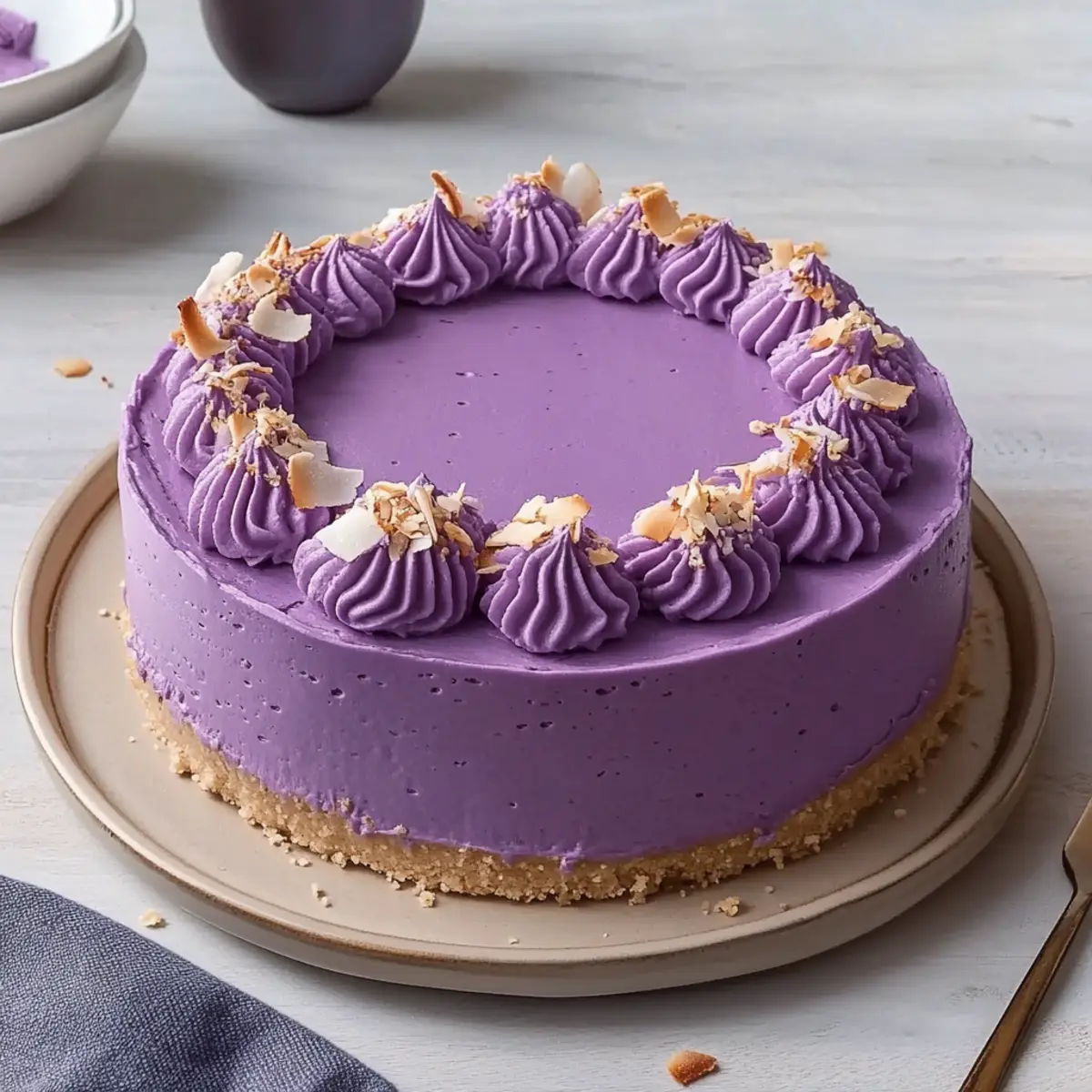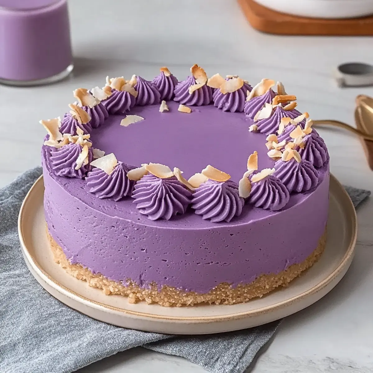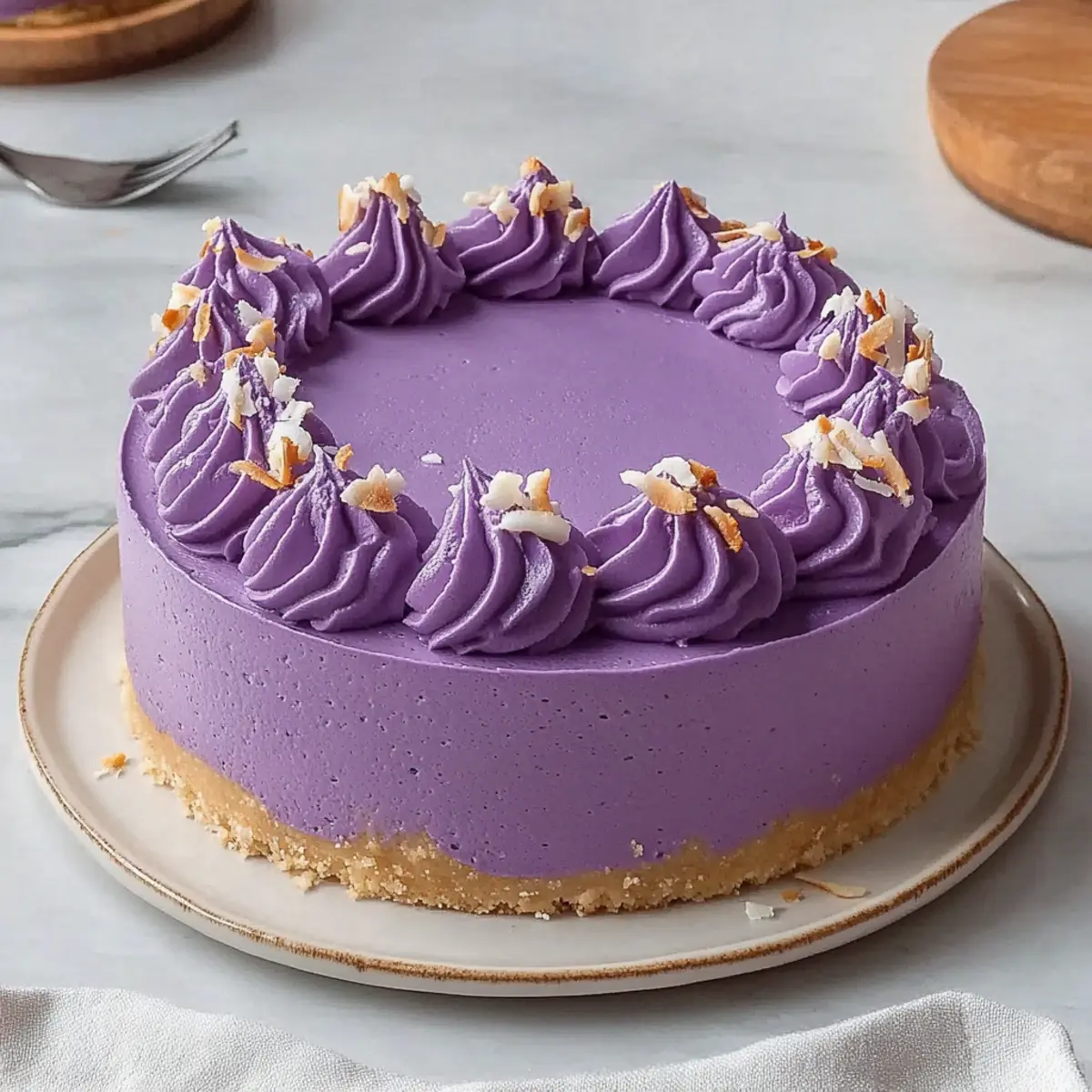 Spread the whipped cream topping evenly over the chilled cheesecake, creating a smooth surface. For an extra touch of tropical flair, sprinkle additional shredded coconut on top just before serving. This visual element elevates your Creamy Ube Cheesecake, making it irresistible!