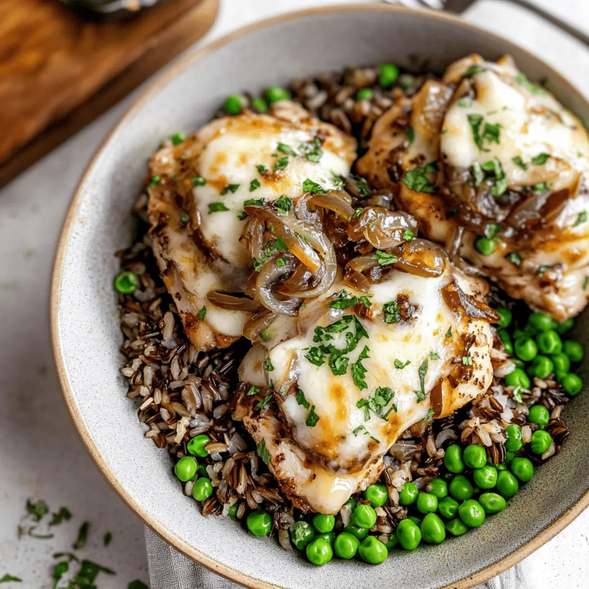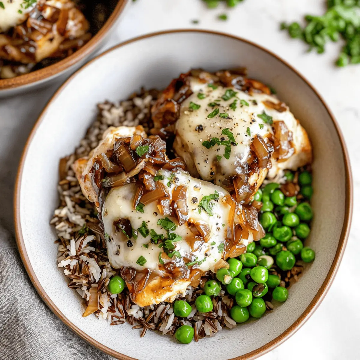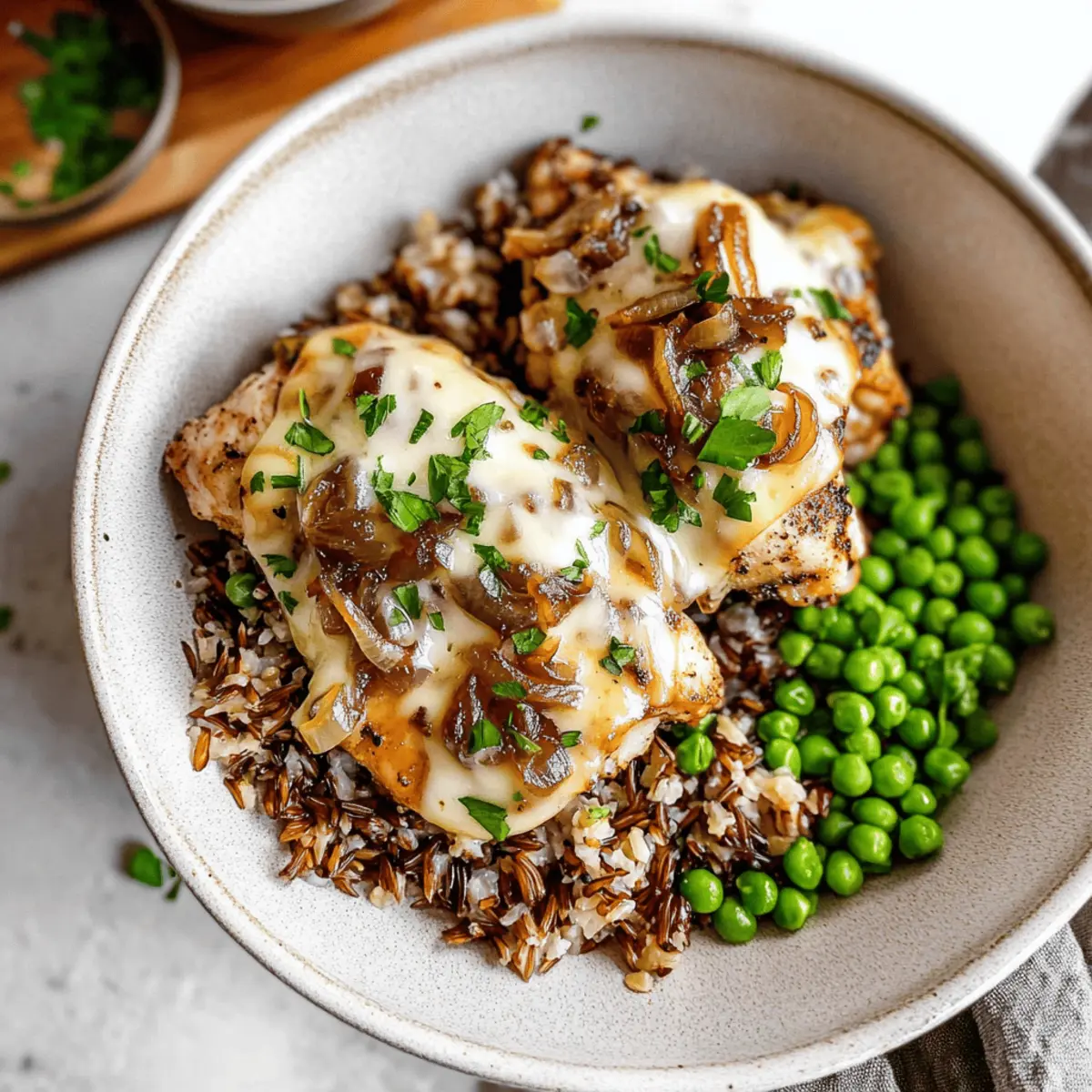 As I stood in my kitchen, the rich aroma of caramelizing onions wafted through the air, instantly whisking me away to the charming bistros of Paris. It’s incredible how a simple dish can evoke such nostalgia! Today, I’m thrilled to share my Savory French Onion Chicken Bowls, a delightful fusion of hearty French onion soup and a wholesome weeknight meal. These gluten-free bowls boast juicy chicken, sweet caramelized onions, and melted cheese, all served over nourishing wild rice and fresh peas. Not only are they a comforting option for your dinner table, but they’re also meal prep-friendly, making busy weeknights a breeze. Who says you can’t enjoy gourmet flavors at home? Are you ready to embrace the cozy magic of French cuisine with a twist? Why are French Onion Chicken Bowls a must-try? Unforgettable Flavor: This combination of caramelized onions, melted cheese, and succulent chicken creates a savory delight that’s simply irresistible. Effortless Meal Prep: Perfect for busy nights, these bowls can easily be made in advance and enjoyed throughout the week. Gluten-Free Goodness: They cater to various dietary needs without compromising on taste. Versatile Ingredients: Feel free to customize with seasonal veggies or swap rice for quinoa for a nutritious twist. Crowd-Pleaser: Ideal for family dinners or entertaining friends, everyone will be asking for seconds! If you’re a fan of comforting dishes, you’ll love these just like my other favorites, such as Avocado Chicken Salad or Bruschetta Chicken Pasta. French Onion Chicken Bowls Ingredients These savory French Onion Chicken Bowls come together with some simple yet flavorful ingredients to create a hearty meal. For the Onions and Sauce Yellow Onions – Sweetness and depth of flavor; substitute with white onions if needed, avoid red onions. Butter – Adds richness and aids in caramelizing the onions; clarified butter can be used for lactose-free options. Salt – Enhances flavor throughout the dish; adjust to taste. Balsamic Vinegar – Provides acidity and richness; red wine vinegar can be a substitute. Worcestershire Sauce – Adds umami flavor; ensure gluten-free brand is used. Dried Thyme – Offers earthy notes; fresh thyme can be used at double the amount. For the Chicken Gruyere Cheese – Creamy, nutty flavor complements the dish; Swiss cheese or provolone are suitable alternatives. Chicken Breasts – Lean protein source; boneless skinless chicken thighs can be substituted as well. Gluten-Free All-Purpose Flour – Coats chicken for a crispy finish and thickens sauce; use cornstarch for an alternative thickener. Pepper – Provides mild heat; freshly ground for best flavor. For the Base Chicken Broth – Adds moisture and depth of flavor; vegetable broth can be used for a vegetarian option. Dijon Mustard – Introduces tanginess to the sauce; yellow mustard can be used in a pinch. Wild Rice – Rich in nutrients and adds texture; brown rice or quinoa can serve as substitutes. Peas – Add color and sweetness; alternatives include sautéed spinach, brussels sprouts, or zucchini. For Garnishing Fresh Parsley – Garnish for added flavor and color; omit if not available. Step‑by‑Step Instructions for French Onion Chicken Bowls Step 1: Caramelize the Onions Start by melting 2 tablespoons of butter in a large skillet over medium heat. Once the butter is bubbly, add 3 sliced yellow onions and a pinch of salt. Sauté for about 20 minutes, stirring occasionally, until the onions are golden brown and caramelized. This step is crucial to develop the deep, sweet flavors that will make your French Onion Chicken Bowls truly scrumptious. Step 2: Add Seasonings Lower the heat and pour in 2 tablespoons of balsamic vinegar and 1 tablespoon of Worcestershire sauce. Sprinkle in 1 teaspoon of dried thyme, stirring well to combine the flavors. Continue cooking for another 2-3 minutes until the mixture is fragrant. Set the onions aside in the skillet, as their robustness will enhance the chicken when it’s added later. Step 3: Prepare Chicken In a shallow bowl, mix ½ cup of gluten-free all-purpose flour with salt and pepper to taste. Dredge 4 boneless, skinless chicken breasts in the flour mixture, ensuring they are well coated. Bring the skillet back to medium-high heat and add the coated chicken, cooking for about 5-7 minutes on each side until they are golden brown and reach an internal temperature of 165°F (75°C). Step 4: Make Sauce Remove the chicken from the skillet and set aside. Deglaze the pan by pouring in 1 cup of chicken broth and adding 2 tablespoons of Dijon mustard. Scrape up any flavorful bits stuck to the bottom and bring the mixture to a simmer. Cook for approximately 5 minutes, letting the sauce reduce by half for a rich flavor that complements the French Onion Chicken Bowls beautifully. Step 5: Combine Everything Return the chicken to the skillet and spoon the sauce over the pieces. Top each chicken breast with the caramelized onions and 1 cup of shredded Gruyere cheese. Cover the skillet with a lid and let it cook on low heat for 3-5 minutes, or until the cheese melts into a gooey layer that enhances this comforting dish. Step 6: Assemble Bowls While the cheese melts, prepare your base. Cook 1 cup of wild rice according to the package instructions. Once fluffy, scoop the rice into bowls and nestle the cheesy French Onion Chicken on top. Finish by adding a handful of peas and garnishing with freshly chopped parsley for a pop of color. Your French Onion Chicken Bowls are now ready to be served! French Onion Chicken Bowls Variations Feel free to get creative and make these French Onion Chicken Bowls your own with these delicious twists! Cauliflower Rice: Swap wild rice for cauliflower rice for a low-carb alternative that still packs a punch of flavor. It’s a great way to sneak in more veggies, too! Rotisserie Chicken: Use shredded rotisserie chicken for extra convenience and a quick prep time—perfect for those