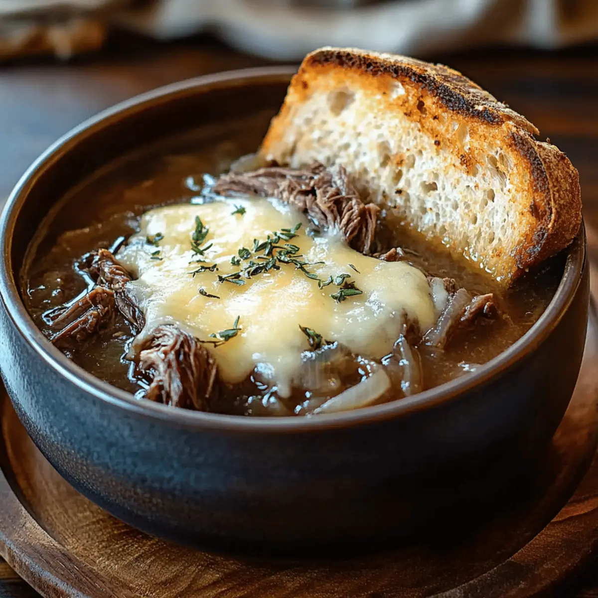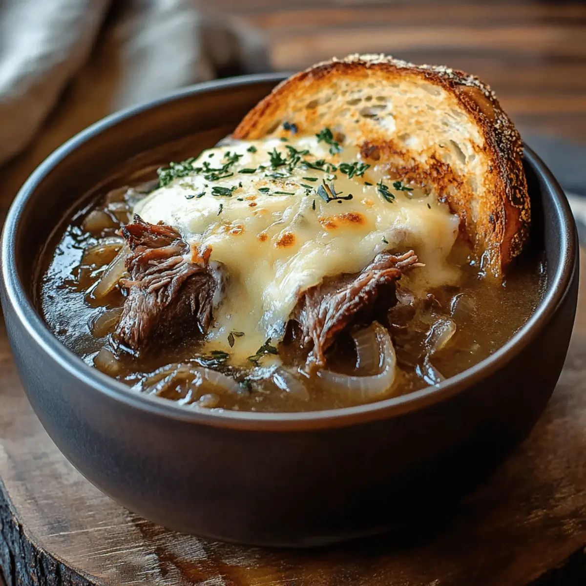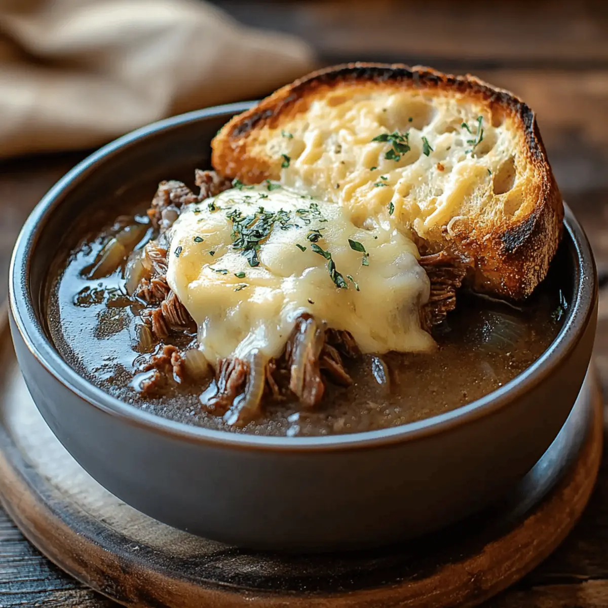 A warm and comforting French Onion Short Rib Soup with Gruyère Toast, perfect for any chilly evening.