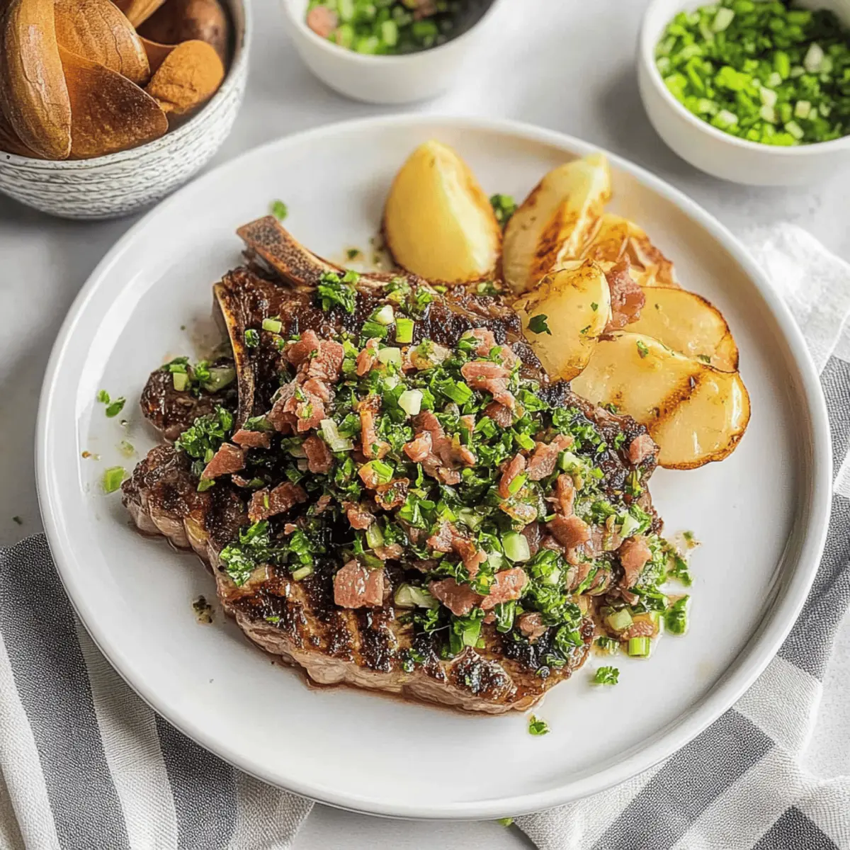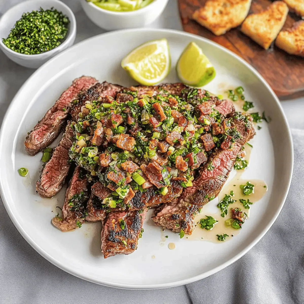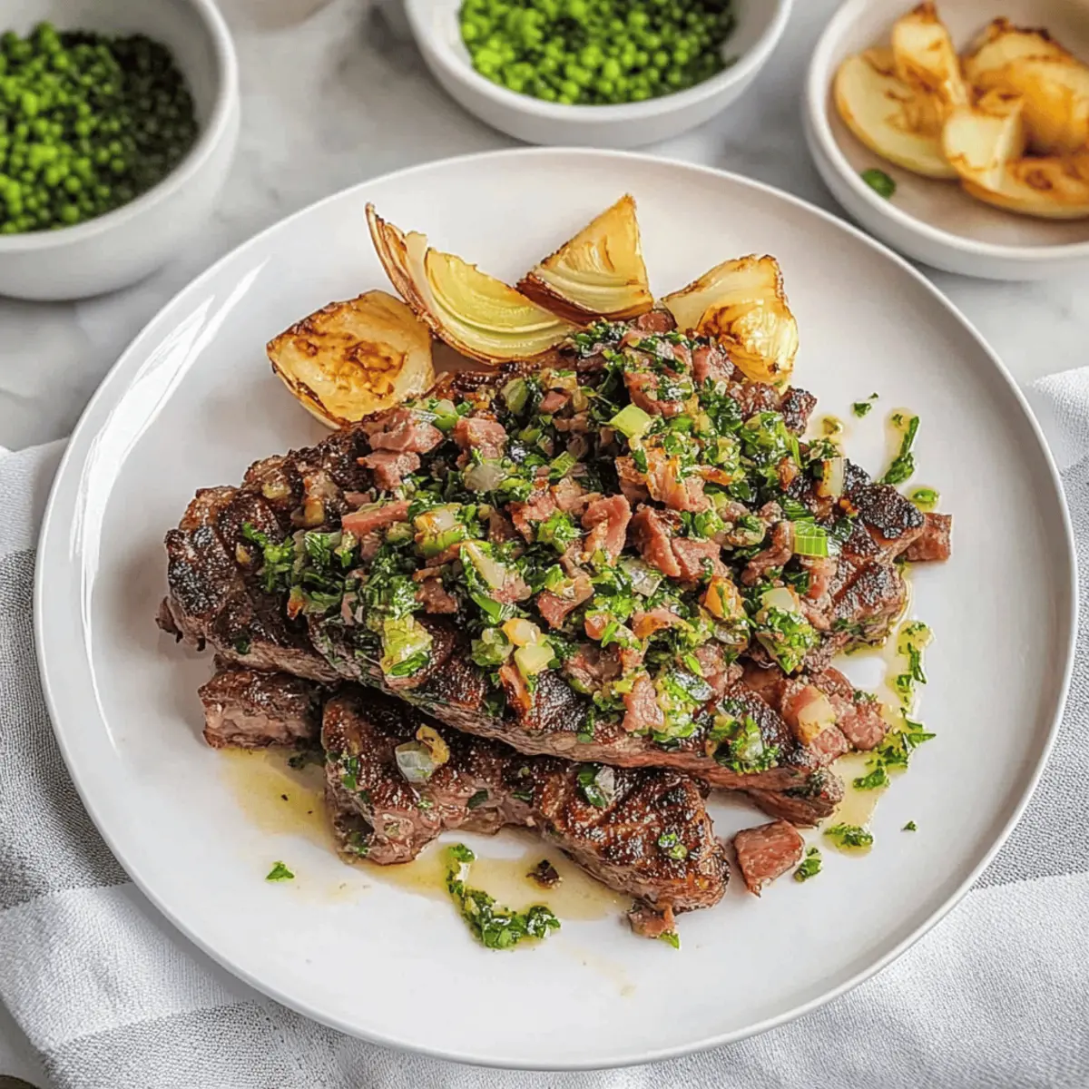 As I stood by the grill, the savory aroma of juicy steaks wafted through the air, instantly igniting my appetite. Today, I’m excited to share my recipe for Grilled Steak with Herbed Scallion Topping, a dinner that effortlessly combines gourmet flair with a relaxed cooking experience. With just a handful of simple ingredients, you can whip up a mouthwatering meal that’s perfect for casual weeknights or special gatherings. One of the best parts? This dish is not only quick to prepare but also a total crowd-pleaser that’ll elevate your dinner game. Imagine delighting your family or friends with perfectly seared steaks adorned with a zesty blend of charred scallions and crispy bacon. Are you ready to impress everyone at your next barbecue? Let’s dive into this delicious recipe together! Why is Grilled Steak with Herbed Scallion a Must-Try? Unforgettable Flavor: The savory combination of charred scallions and crispy bacon pairs perfectly with juicy steaks, creating a tantalizing taste that will linger in your memory. Quick Cooking: This recipe is designed for busy weeknights, allowing you to serve up a gourmet meal in under 30 minutes. Versatile Ingredients: Feel free to swap in skirt or flank steak, or mix in your favorite herbs. This flexibility makes it easy to adapt to your taste! Impressive Presentation: The colorful herbed topping not only adds flair but also impresses guests, making it perfect for any gathering. Crowd-Pleasing Dish: Whether it’s a cozy family dinner or a backyard barbecue, the rich flavors will surely win hearts—and clean plates! Check out our Korean BBQ Steak Bowls for another style of grilled steak that everyone loves! Grilled Steak with Herbed Scallion Ingredients For the Steak • New York Strip Steaks – Juicy and flavorful meat for grilling; alternatives include skirt or flank steak for a similar texture. • Kosher Salt – Enhances the natural flavor of the beef; crucial for seasoning before grilling. • Whole Peppercorns – Coarsely crushed to create an aromatic peppery crust; using a mortar and pestle gives a fresh grind. For the Topping • Green Onions – Charred for a savory topping with a hint of sweetness; feel free to add more for extra garnish. • Garlic – Minced to infuse savory depth into the topping; fresh garlic elevates the flavor compared to powdered varieties. • Parsley – Fresh herb that adds bright, herbal notes; can be swapped with basil or tarragon for variety. • Cilantro – Complements parsley with a citrusy brightness; omit if preferred or replace with additional parsley. • Bacon – Adds smoky crunch and richness; substitutes like pancetta or turkey bacon work well too. • Lemon Juice – Offers a tangy balance to the richness of the bacon; freshly squeezed lemon is ideal for maximum flavor. • Chives – Used for garnishing, adding a mild onion flavor and a delightful pop of color; optional but highly recommended for presentation. Dive into the world of Grilled Steak with Herbed Scallion and let these ingredients create something special for your next meal! Step‑by‑Step Instructions for Grilled Steak with Herbed Scallion Step 1: Season the Steaks Begin by generously seasoning the New York strip steaks with kosher salt and coarsely crushed whole peppercorns. Rub the spices into the meat, ensuring an even coating. Let the steaks rest at room temperature for about 30 minutes to allow the flavors to meld and help achieve a perfect sear when grilled. Step 2: Prepare the Topping While the steaks are resting, heat your grill to medium-high. Place the green onions on the grill grates and cook for 3-4 minutes until they’re charred and softened. Meanwhile, in a cast-iron pan over medium heat, sauté diced bacon until crispy. Once done, set both the bacon and charred scallions aside for the herbed scallion topping. Step 3: Make the Herbed Mixture In a spacious mixing bowl, combine the sautéed bacon, rendered fat, charred green onions, minced garlic, chopped parsley, cilantro, lemon juice, and any reserved peppercorns. Stir well to ensure all ingredients are evenly incorporated, creating a zesty and aromatic topping for your grilled steak. Step 4: Grill the Steaks Now it’s time to grill the steaks! Place the seasoned steaks on the hot grill and sear each side for 3-4 minutes, looking for a rich, brown crust. Use a meat thermometer to check for doneness; aim for an internal temperature of 120-130°F for a delicious medium-rare. Step 5: Rest and Serve Once grilled to your liking, remove the steaks from the grill and wrap them in butcher paper or foil. Let them rest for about 10 minutes to retain their juices, ensuring a tender bite. Finally, serve each steak topped with the flavorful herbed scallion mixture, and optionally, garnish with fresh chives for that extra visual appeal. Grilled Steak with Herbed Scallion Variations Feel free to personalize your grilled steak experience with these delightful twists and substitutions! Alternative Cuts: Swap out New York strip steaks for skirt or flank steak for a leaner option with great flavor. Herb Diversity: Replace parsley with fresh basil, tarragon, or even dill for a unique flavor profile that keeps things fresh. Extra Spice: Add a pinch of crushed red pepper flakes to the herbed topping for a fiery touch that will tantalize your taste buds. Pork-Free Option: Omit the bacon and use olive oil for a lighter topping that still provides great flavor without the meat. Cheesy Addition: Sprinkle crumbled feta or blue cheese on top for a rich, creamy contrast to the herbed scallions. Zesty Kick: Mix in a teaspoon of Dijon mustard to the herbed mixture for an unexpected zing that complements the savory elements beautifully. Grilled Veggies: Toss in some grilled bell peppers or zucchini with the herbed mixture for added texture and flavor, creating a rainbow on your plate. Asian Twist: Infuse some sesame oil into the topping and garnish with toasted sesame seeds for a delicious