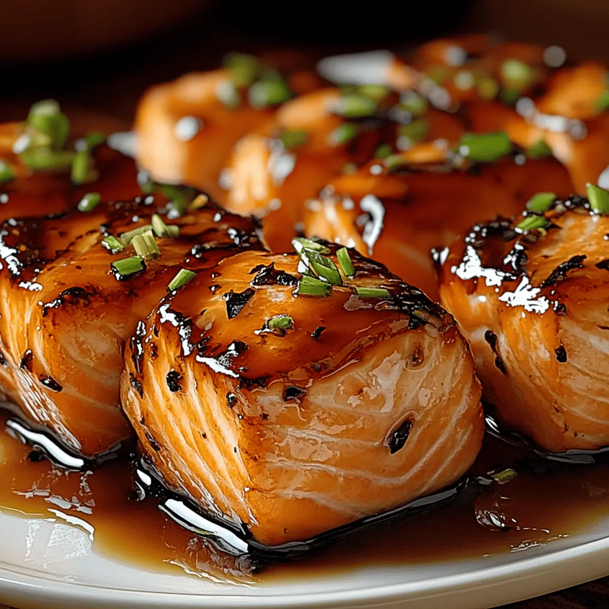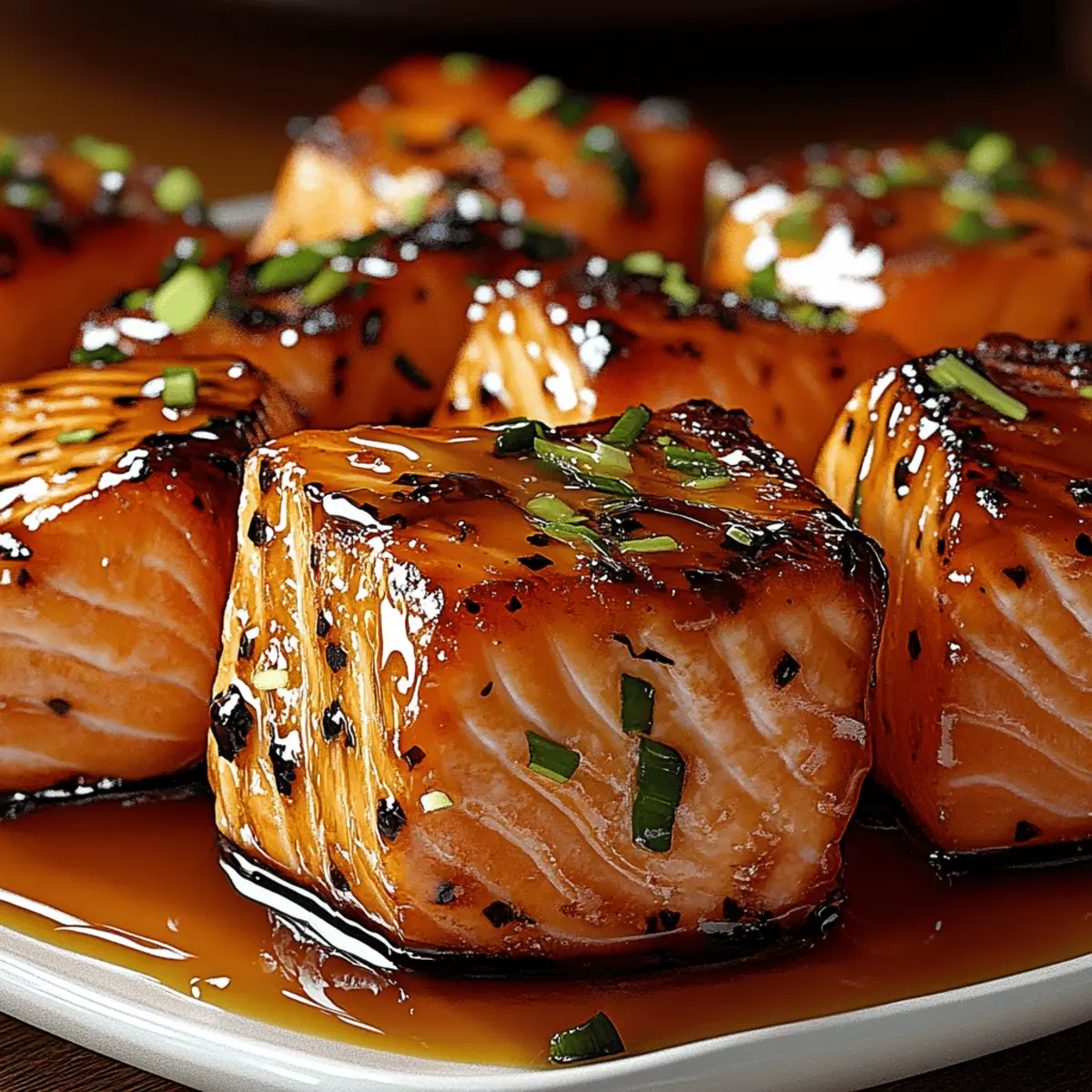 5. Transfer the glazed salmon bites to a serving plate and garnish with green onions and sesame seeds. Serve warm.