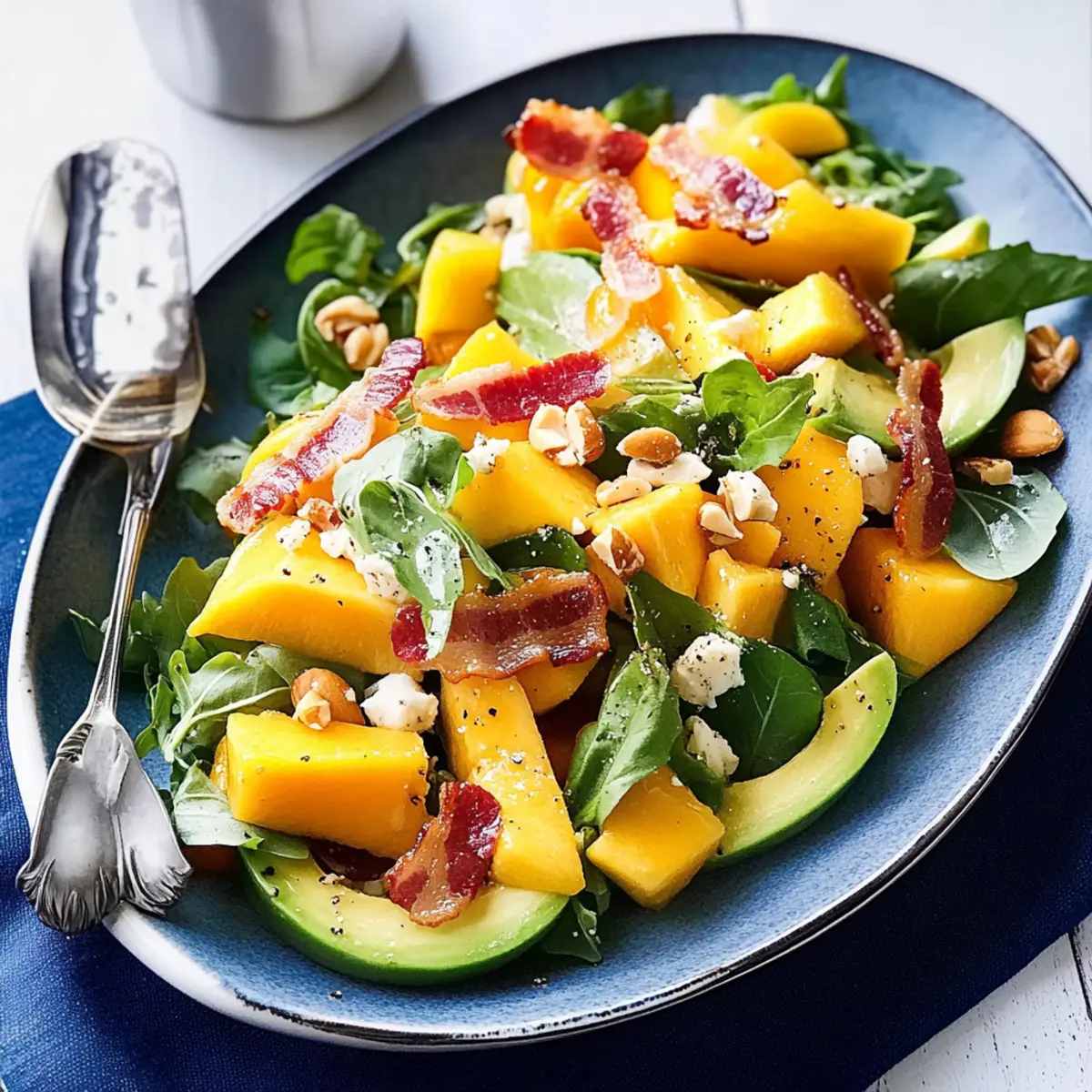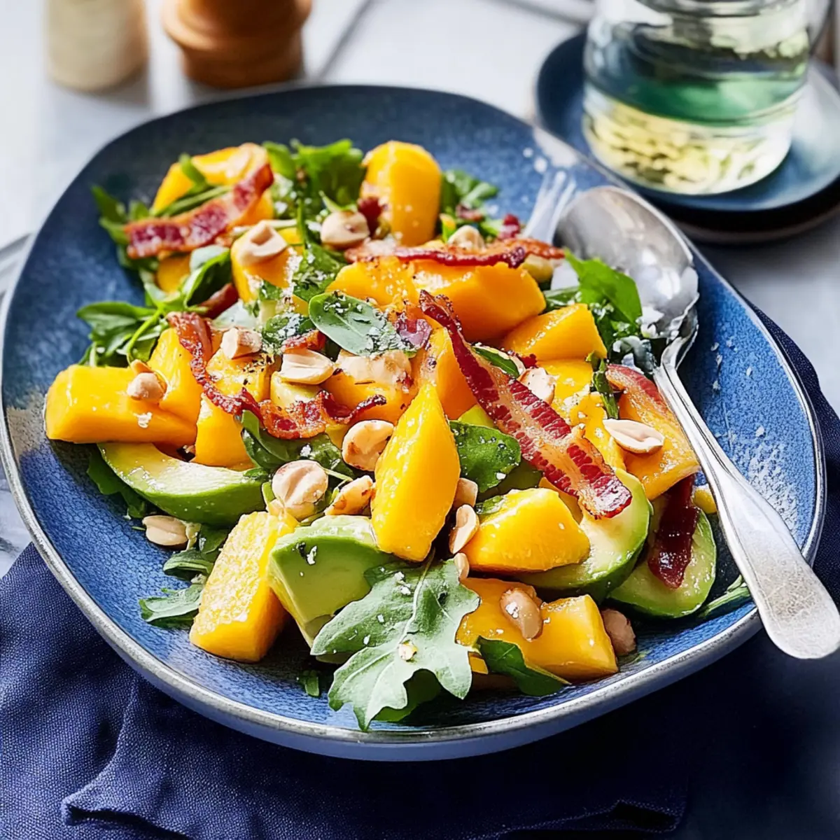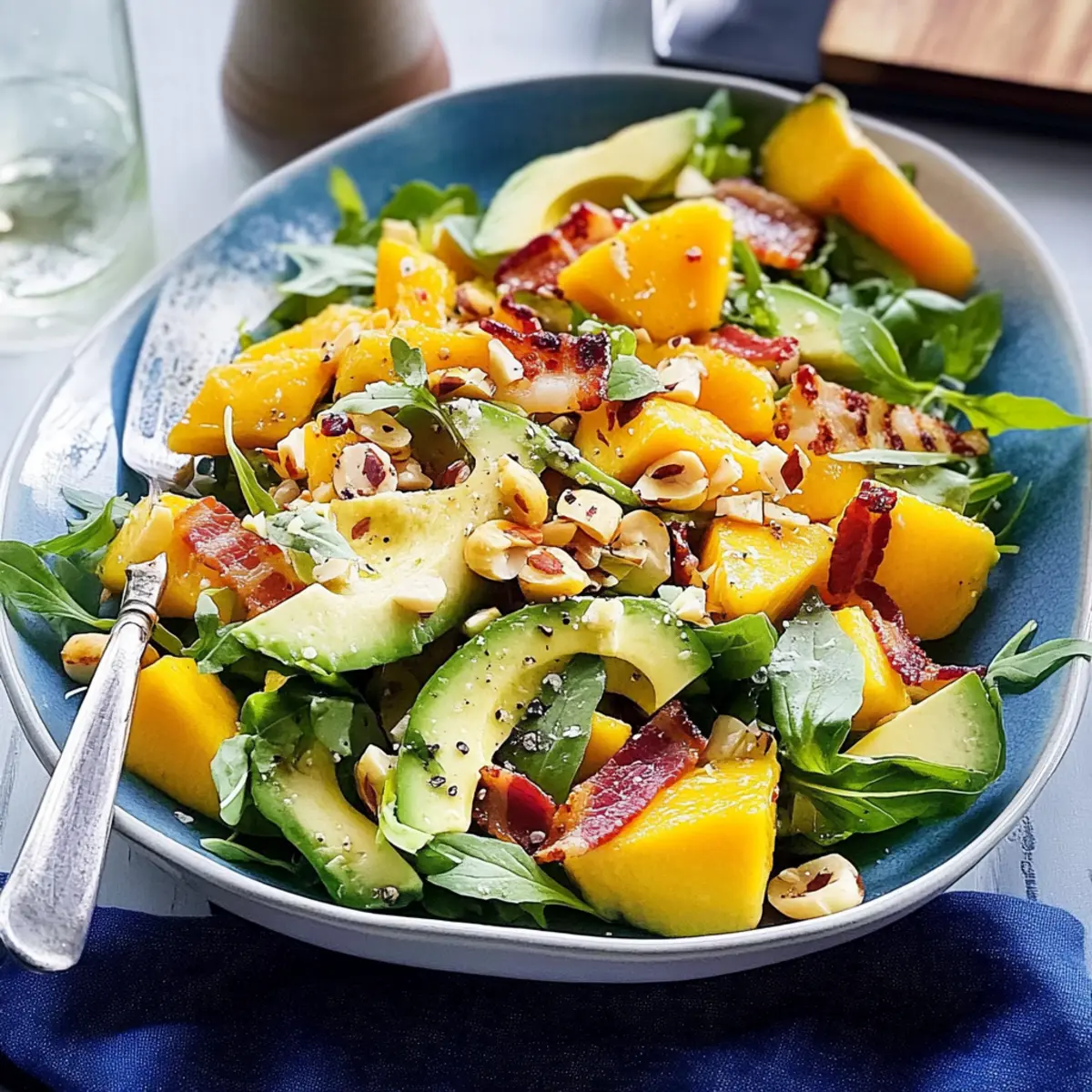 As I chopped the ripe mango on a bright summer afternoon, the sweet aroma filled the air and whisked me away to sun-soaked beaches and backyard barbecues. This mango, avocado, and macadamia salad captures the essence of those warm days perfectly. With its creamy avocado and luscious mango mingling together, it not only delights the senses but also transforms any meal into a celebration. What I love most about this summery dish is its incredible balance of flavors and textures — sautéed macadamia nuts provide that perfect crunch, and it’s undeniably easy to whip together. Whether you’re planning an outdoor gathering or just want to elevate your lunch game, this salad checks all the boxes for a healthful, satisfying bite. Are you ready to savor the taste of summer with me? Why is this salad a must-try? Vibrant Refreshment: This mango, avocado, and macadamia salad bursts with colorful ingredients, making it not just delicious but also a feast for the eyes. Healthful Goodness: Packed with wholesome fats and nutrients, it’s a guilt-free indulgence for any health-conscious eater. Easy Preparation: Whipping up this salad is a breeze, perfect for busy weeknights or impromptu gatherings. Crowd-Pleasing Appeal: Whether at a picnic or a family dinner, this salad is sure to impress your guests and keep them coming back for more! Pair it with a light grilled protein like Grilled California Avocado for a complete meal. Mango, Avocado, and Macadamia Salad Ingredients • Simple ingredients for a refreshing delight! For the Salad Base Baby Cos Lettuce – Fresh greens for structure and crunch; substitute with mixed salad greens if unavailable. Mango – Adds tropical sweetness; use ripe, firm mangoes for the best flavor. Avocado – Provides creaminess; ensure it is ripe but not overripe. Red Onion – Offers a sharp contrast; substitute with green onions for a milder taste. For the Toppings Bacon – Introduces a crispy, savory note; turkey bacon can be substituted for a lighter option. Hard-Boiled Eggs (optional) – Adds protein and heartiness; omit if you prefer a vegan option. Toasted Macadamias – For crunch and richness; pecans or walnuts make great alternatives. For the Dressing Olive Oil – Base for the vinaigrette; can substitute with avocado oil for a different flavor. White Wine Vinegar – Provides acidity; use apple cider vinegar for a unique twist. Dijon Mustard – Enhances dressing richness; substitute with whole grain mustard if desired. Sea-salt flakes and freshly ground black pepper – Essential for seasoning to taste, elevating the overall flavor of the mango, avocado, and macadamia salad. Step‑by‑Step Instructions for mango, avocado and macadamia salad Step 1: Prepare the Salad Base Start by washing and separating the baby Cos lettuce, then place it in a large serving dish. Slice the ripe mango into cubes and scoop out the creamy avocado, adding both fruits to the dish. Aim for vibrant colors and contrasting textures as you layer the mango and avocado over the crispy lettuce for a refreshing base to your mango, avocado and macadamia salad. Step 2: Add Toppings Next, prepare the toppings for your salad. Cook the bacon until crispy in a skillet over medium heat, about 5-7 minutes, then crumble it into pieces. Sprinkle the crispy bacon, chopped hard-boiled eggs (if using), and thinly sliced red onion atop the salad. Finally, fold in roughly chopped toasted macadamias to add a delightful crunch and rich flavor to this mango, avocado and macadamia salad. Step 3: Make the Dressing In a small jug, combine ¼ cup of olive oil, 2 tablespoons of white wine vinegar, and 1 teaspoon of Dijon mustard. Whisk until it emulsifies — you want a smooth, creamy consistency that coats the back of a spoon. Season with sea-salt flakes and freshly ground black pepper to taste, adjusting based on your preference. This dressing will elevate your mango, avocado and macadamia salad with its zesty and creamy profile. Step 4: Serve Just before serving, drizzle the dressing generously over the salad. Toss gently to ensure the ingredients are evenly coated, but be careful not to mash the avocado. For an extra touch of decadence, top it off with shaved parmesan and fresh basil leaves for an aromatic garnish. Enjoy this vibrant mango, avocado and macadamia salad cool, making it an ideal dish for summer outings or a refreshing side for any meal. Make Ahead Options These mango, avocado, and macadamia salad components are perfect for meal prep! You can prepare the salad base (baby Cos lettuce, diced mango, and avocado) up to 24 hours in advance; simply mix the first two ingredients and store them in an airtight container. To prevent the avocado from browning, squeeze a bit of lemon juice over it before sealing. The bacon and hard-boiled eggs can be cooked and stored separately in the fridge for up to 3 days. Keep the dressing in a separate jar for maximum freshness. When ready to serve, combine everything in a bowl, drizzle with dressing, and toss gently for a refreshing meal with minimal effort! How to Store and Freeze Mango, Avocado, and Macadamia Salad Fridge: Store leftover salad in an airtight container in the fridge for up to 3 days. Keep the dressing separate to maintain freshness. Freezer: Freezing is not recommended for this salad due to the texture of avocado and mango once thawed. Preparation: If making ahead, prepare all components separately and combine them just before serving to enjoy crispy textures and vibrant flavors in your mango, avocado, and macadamia salad. Reheating (if applicable): Not necessary for salads, but if you need to warm up any ingredients like bacon, do so in a skillet over low heat until heated through without overcooking. What to Serve with Mango, Avocado, and Macadamia Salad Elevate your dining experience by discovering the perfect accompaniments to this tangy summer delight. Grilled Chicken: Juicy grilled chicken adds a hearty, protein-packed element that perfect