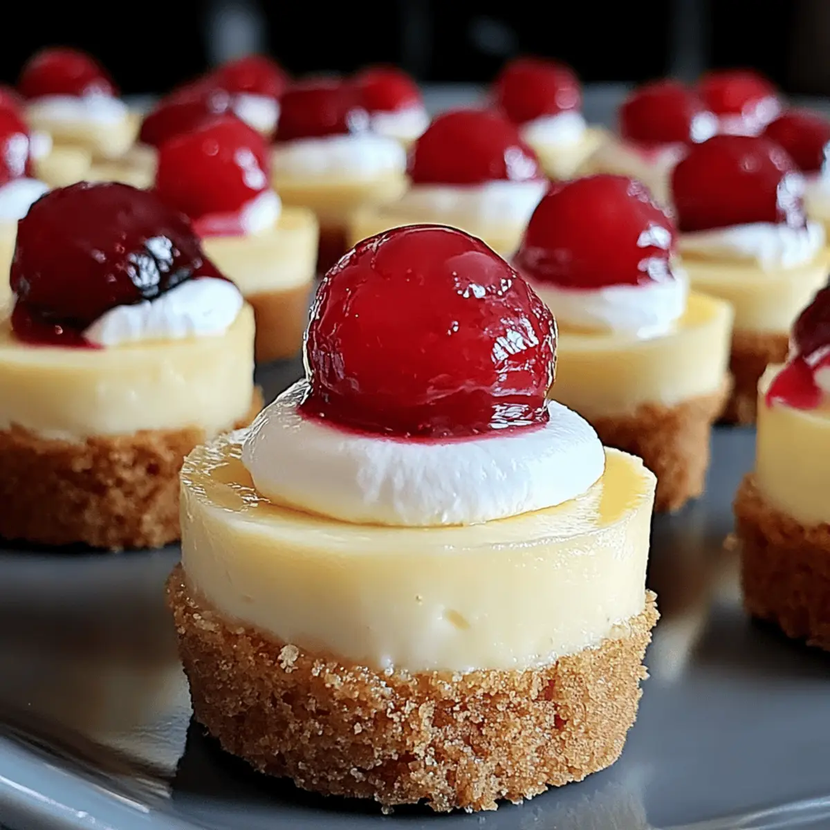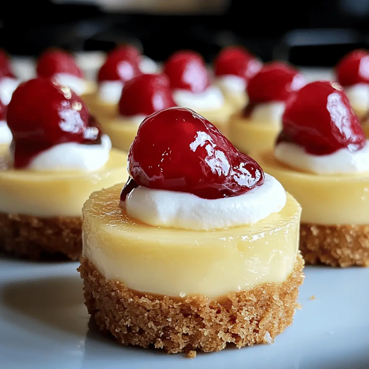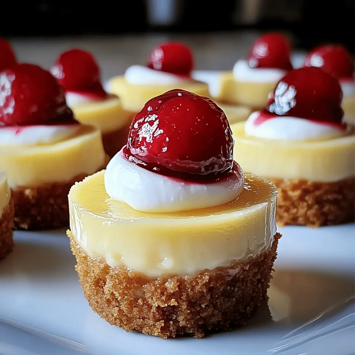 As I stood in my kitchen, the fragrant aroma of cream cheese and vanilla wafting through the air, I couldn’t help but feel a sense of nostalgia—these Super Easy Mini Cheesecakes with Vanilla Wafer Crust remind me of the carefree days of summer gatherings and sweet indulgences. These delightful little treats not only bring joy to any occasion, but they also simplify the cheesecake experience without sacrificing flavor. With a heavenly, creamy filling paired with a crispy, buttery crust, they are beginner-friendly and perfect for impressing friends and family alike. Plus, their versatility means you can mix and match crusts or toppings to create your personalized masterpiece. So, are you ready to dive into the world of mini cheesecakes and discover your favorite twist? Why Are Mini Cheesecakes So Irresistible? Heavenly flavor: The combination of creamy filling and crunchy vanilla wafer crust creates a mouthwatering experience that’s hard to resist. Beginner-friendly: You don’t need to be a pro chef; this recipe is simple enough for anyone to tackle. Versatile options: Feel free to customize your crust with graham crackers or chocolate wafers, or experiment with various toppings like fresh berries or chocolate drizzle. Perfect for gatherings: These mini cheesecakes are just the right portion for parties or family get-togethers, making them incredibly crowd-pleasing. Make-ahead convenience: Prepare them in advance and store in the fridge, allowing for easy entertaining without last-minute stress. Dive into these heavenly delights and make sure to check out my recipes for Mini Cannoli Cups or a refreshing Lemonade Twist to complement your dessert spread! Mini Cheesecakes with Vanilla Wafer Crust Ingredients • Here’s everything you need to create perfectly delightful mini cheesecakes! For the Crust Vanilla Wafers – A sweet base that adds crunch; try substituting with graham crackers for a different flavor twist. Unsalted Butter – Binds your crust together perfectly; make sure it’s melted for easy mixing. For the Cheesecake Filling Full-Fat Cream Cheese – The star of the show, providing a rich texture; ensure it’s softened to achieve creaminess. Granulated Sugar – Adds just the right amount of sweetness to balance the filling; adjust to your taste. Full-Fat Sour Cream – Delivers a tangy flavor and moisture; room temperature helps in blending smoothly. Large Eggs – Essential for structure; using eggs at room temperature will help them mix better. Pure Vanilla Extract – Enhances the flavor depth of your mini cheesecakes; quality matters here! Salt – A little pinch is crucial to mellow out the sweetness and enhance overall flavor. For Optional Garnishes Fresh Berries – Add a burst of flavor and color; strawberries, blueberries, or raspberries work beautifully. Whipped Cream – A creamy, indulgent topping that makes each mini cheesecake feel extra special. Lemon Zest – A sprinkle of zest adds a refreshing twist that can brighten up the flavor profile. Chocolate Drizzle or Caramel Sauce – Elevate the sweetness and presentation with drizzles of your favorite sauce. Now that you’re equipped with all the ingredients for your Mini Cheesecakes with Vanilla Wafer Crust, let your creativity flow and enjoy the process! Step‑by‑Step Instructions for Mini Cheesecakes with Vanilla Wafer Crust Step 1: Prepare Pan & Crust Preheat your oven to 325°F (160°C). Line a 12-cup muffin tin with paper liners for easy removal. In a medium bowl, mix finely crushed vanilla wafers with melted butter until well combined. Press this mixture firmly into the bottom of each liner to form a crust, ensuring it’s evenly distributed. Pre-bake in the oven for 5-7 minutes until lightly golden, then remove and allow to cool slightly. Step 2: Make Creamy Cheesecake Filling In a large mixing bowl, beat the softened cream cheese using an electric mixer until it’s smooth and creamy. Gradually add granulated sugar, mixing well until fully incorporated. Then, blend in sour cream, pure vanilla extract, and a pinch of salt, mixing until smooth. Add the eggs one at a time, beating gently after each addition, just until combined, creating a luscious filling for your mini cheesecakes. Step 3: Bake Mini Cheesecakes Carefully pour the cheesecake batter into each pre-baked crust, filling them about two-thirds full. To eliminate air bubbles, gently tap the muffin tin on the counter. Place the filled tin back in the oven and bake for 18-22 minutes. The edges should be set while the centers remain slightly jiggly, signaling that they are perfectly done and will firm up during cooling. Step 4: Cool and Chill for Perfection Once baked, turn off the oven and leave the cheesecakes inside with the door slightly ajar for about 30 minutes. This ensures a gentle cooling process to help prevent cracks. Afterward, transfer the mini cheesecakes to a wire rack to cool completely at room temperature, then cover with plastic wrap and refrigerate for at least 3-4 hours to let the flavors settle—overnight is best! Step 5: Garnish and Serve Before serving your delicious Mini Cheesecakes with Vanilla Wafer Crust, take them out of the fridge. Decorate each cheesecake with your choice of optional toppings such as fresh berries or a dollop of whipped cream for that special touch. Drizzle with chocolate or caramel sauce if desired, and prepare for the delightful experience as you serve these beautiful, creamy treats! Storage Tips for Mini Cheesecakes with Vanilla Wafer Crust Fridge: Store mini cheesecakes in an airtight container for up to 3-4 days. This keeps them fresh and delicious for your next indulgent treat. Freezer: These mini cheesecakes freeze beautifully for up to 1 month. Wrap them tightly in plastic wrap and place in a freezer-safe container. Thaw in the refrigerator before serving to maintain their creamy texture. Reheating: While these treats are best enjoyed chilled, if you prefer them slightly warm, place 
