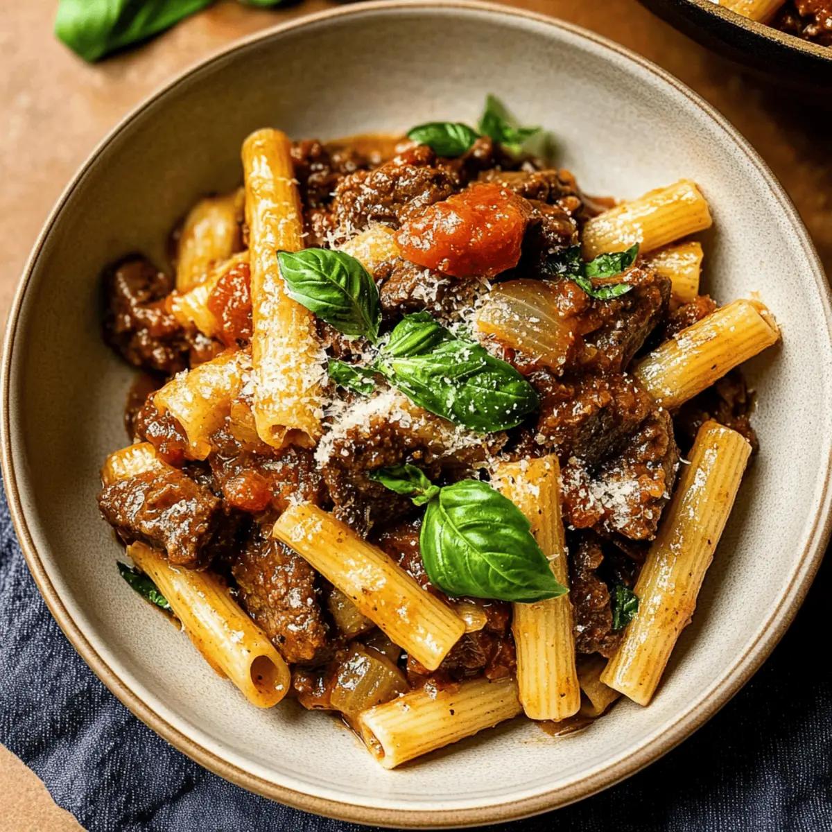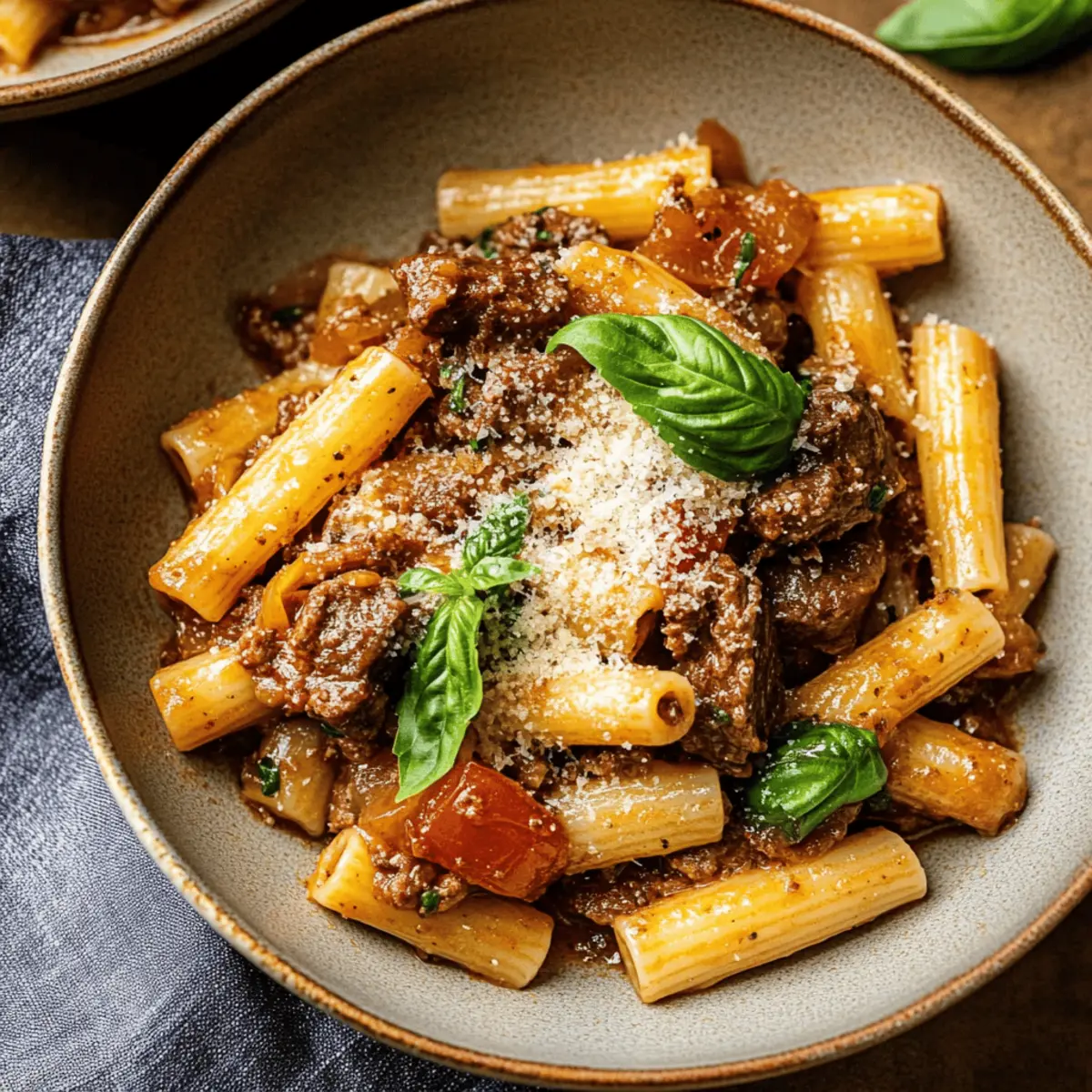 Indulge in a warm, hearty Pasta alla Genovese, featuring tender braised beef and sweet caramelized onions, perfect for winter nights.