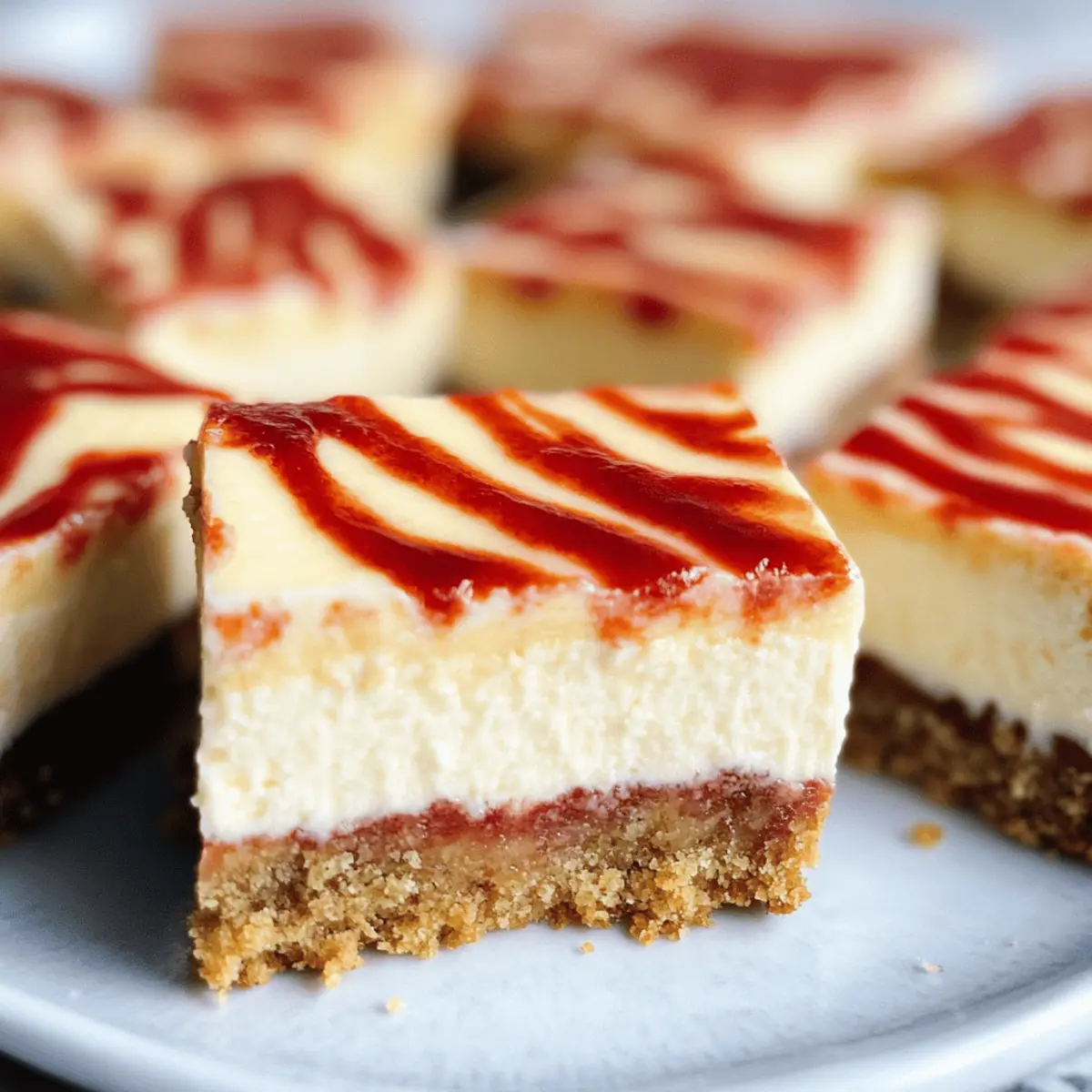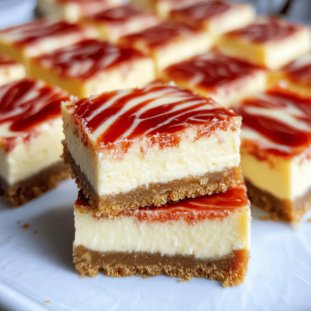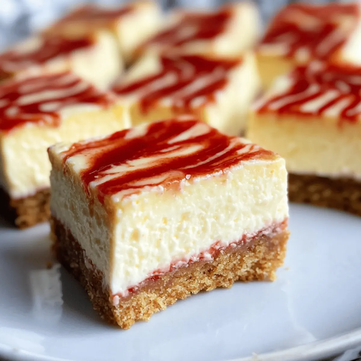 As I pulled the warm pan from the oven, the rich aroma of cream cheese and buttery graham cracker wafted through the kitchen, instantly transporting me to a cozy café. These Easy Philadelphia Cheesecake Bars are not just a delightful dessert; they embody simplicity and versatility, making them the perfect choice for any occasion. With a creamy filling that literally melts in your mouth and a buttery crust that adds the ideal crunch, this recipe is a real winner among homemade desserts. The best part? They’re incredibly freezer-friendly, so you can whip up a batch ahead of time and treat yourself whenever the craving strikes. Whether you enjoy them plain or jazz them up with flavorful swirls of fruit, these cheesecake bars are bound to impress. Aren’t you curious to see how easily you can make these luscious bars at home? Why Are These Cheesecake Bars So Amazing? Undeniably Easy: You don’t need to be a baking pro to recreate this treat. The steps are simple and straightforward, perfect for beginner cooks. Freezer-Friendly: Make them ahead of time and store in the freezer! Perfect for last-minute dessert emergencies or simply treating yourself anytime. Endless Customization: From adding chocolate chips to swirling in your favorite fruit jam, these bars offer a blank canvas for your creativity. Also, check out our Crisp Cheesecake Bars for another delightful twist! Crowd-Pleaser: These bars are a sure-hit at gatherings, appealing to both cheesecake lovers and casual dessert fans alike. Your guests will keep coming back for more! Perfect Texture: Experience the luxurious balance of creamy filling with a crunchy crust – a delightful contrast that everyone will adore! Quick to Assemble: With minimal prep time, you can whip up these bars with ease, making dessert a stress-free experience. Try this recipe, and you’ll be wondering how you ever lived without it! Philadelphia Cheesecake Bars Ingredients For the Crust • Graham Cracker Crumbs – Creates a delicious, buttery base; swap with gluten-free crumbs for gluten-sensitive diets. • Unsalted Butter – Adds richness and binds the crust together; can be replaced with coconut oil for a dairy-free option. • Granulated Sugar – Sweetens both the crust and filling; try coconut sugar for a healthier alternative. For the Filling • Philadelphia Cream Cheese – The star of the show that provides that creamy, indulgent texture; ensure it’s softened for smooth mixing. • Large Eggs – Essential for giving structure to the filling; flax eggs can be used as a vegan substitute. • Vanilla Extract – Elevates the flavor profile; almond extract can be substituted for a nuttier kick. • Pinch of Salt – Balances sweetness and enhances overall flavors. Optional Add-ins • Strawberry Jam or Puree – Adds a fruity swirl and vibrant color; can be replaced with any berry jam or omitted for pure cheesecake flavor. These ingredients come together to create decadent Philadelphia Cheesecake Bars that will delight your family and friends! Enjoy making this easy cheesecake recipe that is completely customizable to your taste. Step‑by‑Step Instructions for Philadelphia Cheesecake Bars Step 1: Preheat the Oven Start by preheating your oven to 325°F (163°C). This temperature ensures that your Philadelphia Cheesecake Bars bake evenly. While the oven warms up, line a 9×9-inch baking pan with parchment paper, allowing some paper to hang over the edges for easy removal later. Step 2: Prepare the Crust In a mixing bowl, combine 1 cup of graham cracker crumbs, 1/3 cup of melted unsalted butter, and 1/4 cup of granulated sugar. Use a fork to mix until the mixture resembles wet sand. Firmly press this mixture into the bottom of the prepared pan to create a solid base for your cheesecake bars. Step 3: Bake the Crust Place the pan in the preheated oven and bake the crust for 10 minutes. After baking, remove the pan and allow it to cool while you prepare the filling. The crust should be slightly golden and fragrant, indicating it’s ready for the cream cheese filling. Step 4: Mix the Filling In a large bowl, beat 16 oz of softened Philadelphia cream cheese with a hand mixer until smooth and creamy. Gradually add 1/2 cup of granulated sugar, 2 large eggs, 1 teaspoon of vanilla extract, and a pinch of salt. Mix until just combined—be careful not to overmix, as this can lead to cracks later. Step 5: Pour the Filling Pour the creamy cheesecake filling over the cooled graham cracker crust. Use a spatula to smooth the top evenly, ensuring every inch is covered. This step is crucial for achieving the perfect texture in your Philadelphia Cheesecake Bars. Step 6: Add Optional Swirls If desired, dot spoonfuls of strawberry jam or puree across the filling. Take a butter knife and gently swirl it through the filling to create a beautiful marbled effect. This adds both flavor and an appealing presentation to your cheesecake bars. Step 7: Bake the Cheesecake Bars Return the pan to the oven and bake for 35–40 minutes. The edges should appear set, while the center should still jiggle slightly when you shake the pan. This indicates that your bars will be creamy and not overcooked. Step 8: Cool and Chill Once baked, turn off the oven and crack the door open. Let the cheesecake bars cool in the warm oven for 30 minutes to prevent cracking. Afterward, refrigerate for at least 4 hours, or overnight if possible, to allow them to set fully before slicing into squares. What to Serve with Philadelphia Cheesecake Bars These delightful cheesecake bars not only shine on their own but also pair beautifully with a variety of sides and treats that will elevate your dessert experience. Fresh Berries: Juicy strawberries or blueberries add a burst of flavor and a refreshing contrast to the creamy bars. Whipped Cream: Light and fluffy, a dollop of homemade whipped cream adds an airy touch, making each bite indulgent and decadent. Chocolate Sauce: Drizzle warm chocolate sauce ov