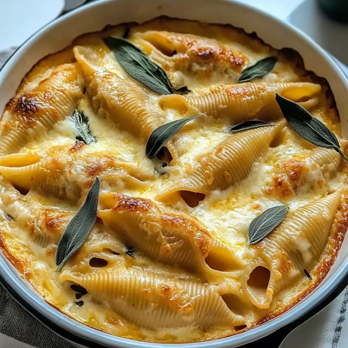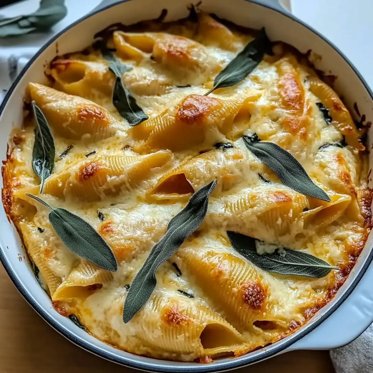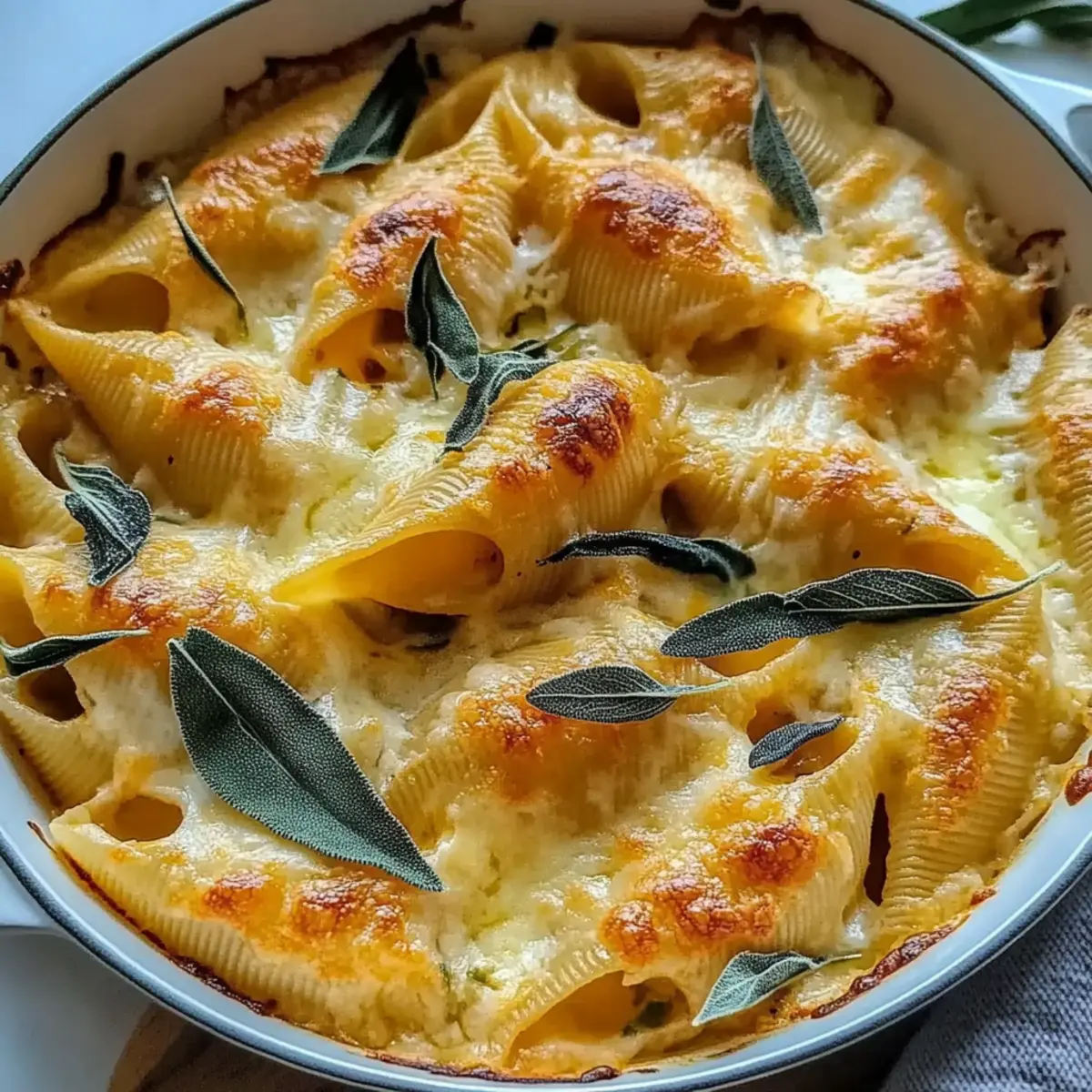 As the leaves start to turn and the air becomes crisp, I find myself craving those comforting flavors that remind me of cozy autumn evenings. One dish that has become a personal favorite is my Pumpkin & Gouda Stuffed Shells with Brown Butter Sage Alfredo Sauce. These delightful shells are a beautiful blend of sweet pumpkin and creamy Gouda, all embraced by a rich, nutty brown butter sauce infused with fragrant sage. Not only are they a show-stopping centerpiece for any fall gathering, but they also promise quick prep, allowing you to keep the focus on what really matters—sharing good food with loved ones. Are you ready to dive into this season’s most satisfying comfort food? Let’s get cooking! Why are Pumpkin & Gouda Shells irresistible? Comforting Delight: These stuffed shells bring warmth and familiarity to your dining table, making them perfect for chilly evenings. Rich Flavor Profile: The fusion of creamy Gouda and sweet pumpkin creates a depth of flavor that will tantalize your taste buds. Impressive Presentation: With their inviting golden hue, they are certain to impress guests at any fall gathering. Quick and Easy: This recipe is designed for simplicity, ensuring fresh, homemade goodness without the hassle. Perfect for those who want to escape fast food! Versatile Options: Want to add some greens? Toss in spinach or kale for a nutritional boost while keeping all that creamy goodness intact. For a fun twist, consider making these Garlic Butter Beef filled shells as well! Pumpkin & Gouda Stuffed Shells Ingredients For the Pasta Shells • Large Pasta Shells – Use shells that hold the filling well for the best bite. For the Filling • Pumpkin Puree – This is essential for that sweet, comforting flavor; avoid using pumpkin pie filling for this recipe. • Shredded Gouda Cheese – The key to richness; feel free to swap for smoked Gouda for an extra layer of flavor. • Ricotta Cheese – Adds creaminess; low-fat ricotta can lighten the dish without losing its comfort. • Grated Parmesan Cheese – Freshly grated is best for maximum flavor; it enhances the overall richness. • Garlic Powder – Adds aromatic depth; fresh garlic can be used if you prefer a stronger taste. • Nutmeg – Provides that warm fall spice; freshly grated will elevate the flavor. • Fresh Sage – This herb brings freshness; if needed, dried sage works, though fresh is ideal for aroma. For the Sauce • Olive Oil – For moisture; avocado oil is a suitable alternative. • Salt and Pepper – Essential for seasoning; adjust to your taste. • Heavy Cream – This ensures a creamy texture in the sauce; half-and-half can be a lighter substitute. • Unsalted Butter – Essential for richness in the sauce; vegan butter can be used for a dairy-free option. • Fresh Sage Leaves for Frying (optional) – Adds both garnish and a flavor boost; can be omitted but they provide a lovely crunch. Enjoy crafting this comforting masterpiece—the Pumpkin & Gouda Stuffed Shells with Brown Butter & Sage Alfredo Sauce is sure to become a seasonal favorite! Step‑by‑Step Instructions for Pumpkin & Gouda Stuffed Shells With Brown Butter & Sage Alfredo Sauce Step 1: Preheat the Oven Begin by preheating your oven to 375°F (190°C). While the oven warms up, take a moment to lightly grease a baking dish, ensuring the stuffed shells won’t stick during baking. This preparation step is essential for achieving that beautifully golden finish on your Pumpkin & Gouda Stuffed Shells. Step 2: Cook the Pasta Shells In a large pot, bring salted water to a rolling boil. Carefully add the large pasta shells and cook according to the package instructions until al dente, typically around 9-11 minutes. Once done, drain the shells in a colander and set them aside to cool, allowing them to firm up before filling. Step 3: Prepare the Filling In a mixing bowl, combine the pumpkin puree, shredded Gouda cheese, ricotta, grated Parmesan, garlic powder, nutmeg, and chopped fresh sage. Drizzle in a bit of olive oil, then season the mixture with salt and pepper to your taste. Stir everything together until you achieve a smooth, creamy consistency that captures the essence of fall flavors for your stuffed shells. Step 4: Stuff the Shells Using a spoon or a piping bag, carefully fill each cooked pasta shell with the pumpkin and Gouda mixture, ensuring they’re generously filled. Place the filled shells seam-side up in your prepared baking dish, creating a lovely arrangement. This step not only builds flavor but also transforms your dish into a feast for the eyes. Step 5: Make the Alfredo Sauce In a medium saucepan over medium heat, melt the unsalted butter until it becomes golden brown and nutty, which usually takes about 3-5 minutes. Once golden, pour in the heavy cream, stirring to combine, and add the remaining sage. Season with salt and pepper, letting the sauce simmer gently for a few minutes, allowing the flavors to meld beautifully into the sauce. Step 6: Combine the Dish Pour the rich brown butter sage Alfredo sauce evenly over the stuffed shells, ensuring each shell is well-coated. This heavenly sauce not only enhances the flavor of your Pumpkin & Gouda Stuffed Shells but also creates a luscious, creamy layer that will delight everyone at the table. Step 7: Bake Cover the baking dish with foil and place it in the preheated oven. Bake for 20 minutes, then carefully remove the foil and continue baking for an additional 10-15 minutes or until the tops are bubbly and golden brown. Keep an eye on the shells, as they reach the perfect doneness when lightly browned on top and warm throughout. Expert Tips for Pumpkin & Gouda Stuffed Shells Prevent Pasta Breakage: Use large pasta shells: Ensure the shells are large enough to hold the filling comfortably, and avoid overcooking them to prevent breakage. Achieve Creamy Filling: Balance moisture: For the best texture, mix the filling just until combined; over-mixing can lead to a watery consi