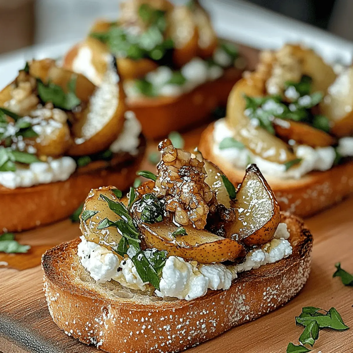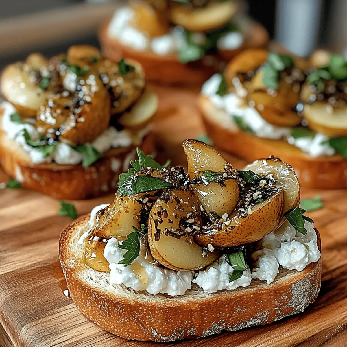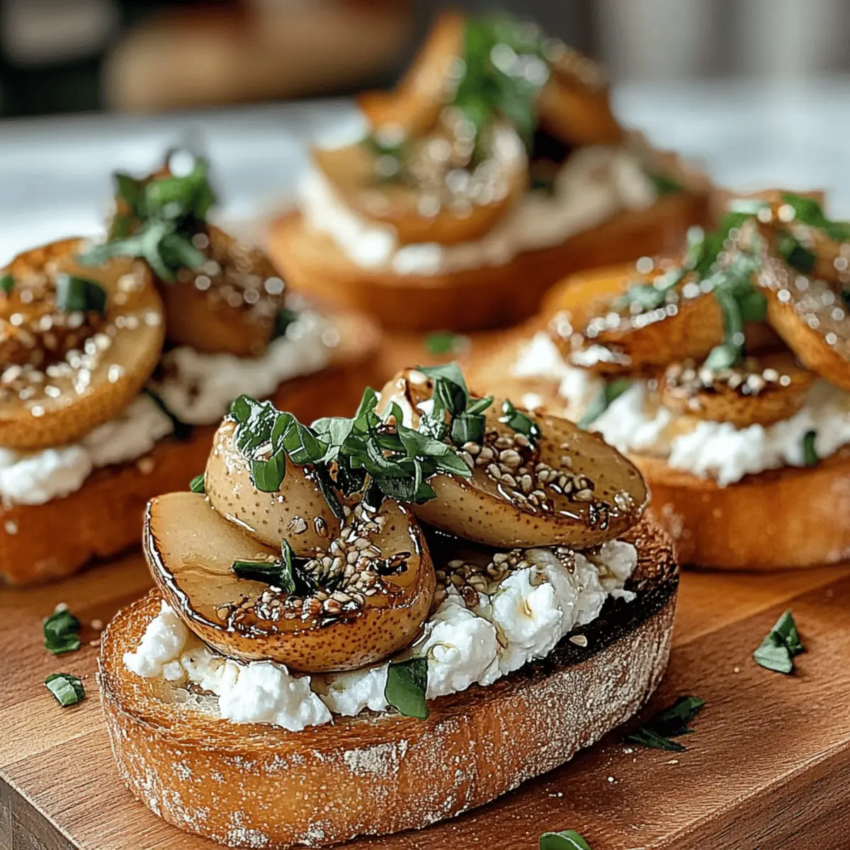 As I stood in my kitchen, the sweet aroma of roasted pears wafted through the air, instantly transporting me to a cozy autumn gathering with friends. That’s when I realized I was onto something magical with my Roasted Pear Honey Crostini. This elegant appetizer balances delightful sweetness and creamy texture, making it perfect for any occasion. Not only is it simple to prepare, but it’s also versatile—customize it with your favorite toppings to match any palate. Plus, it’s vegetarian-friendly, ensuring that everyone at your table can indulge. Whether it’s a casual get-together or a fancy dinner party, these crostini will elevate your culinary prowess with minimal effort. Curious to learn how to create this mouthwatering dish? Let’s dive into the recipe! Why is this crostini a must-try? Simplicity: This Roasted Pear Honey Crostini requires just a few ingredients and minimal preparation time, making it perfect for busy home cooks. Elegant Flavor: The harmony of sweet roasted pears, creamy goat cheese, and a drizzle of honey elevates your appetizer game effortlessly. Versatility: Customize it with toppings like balsamic glaze or nuts for a personal twist that caters to every taste. Crowd-Pleasing: Ideal for gatherings, this dish is sure to wow your guests and spark conversations! Vegetarian-Friendly: Perfect for diverse diets, ensuring everyone can enjoy a scrumptious bite. If you’re looking for more delicious appetizers, don’t miss my Herb Roasted Chicken or Honey Garlic Turkey options! Roasted Pear Honey Crostini Ingredients For the Crostini Pears – Essential for sweetness and texture; use Bosc or Anjou for best results. Olive Oil – Adds depth of flavor and aids in caramelization; opt for high-quality extra virgin for enhanced taste. Fresh Rosemary – Provides an aromatic, earthy contrast to the sweet pears; fresh is preferred for its vibrant flavor. Salt and Pepper – Enhance overall flavor and balance sweetness. Baguette – Acts as the base; choose a fresh or day-old baguette, cut into 1/2-inch diagonal slices for extra crunch. Goat Cheese – Adds creaminess and a tangy flavor that complements the sweetness of the pears; can be replaced with a vegan option if desired. Honey – Adds natural sweetness and a glossy finish; use high-quality local honey for best flavor. Fresh Arugula – A garnish that introduces peppery freshness and visual appeal; optional but enhances the dish. For the Optional Drizzle Balsamic Glaze – Optional drizzle for extra depth of flavor; choose thick and syrupy varieties for better presentation. Indulge in this Roasted Pear Honey Crostini to delight your friends and family with an appetizer that’s as easy to make as it is delicious! Step‑by‑Step Instructions for Roasted Pear Honey Crostini Step 1: Preheat the Oven Begin by preheating your oven to 400°F (200°C). This temperature is essential for achieving that perfect caramelization of the pears and crispiness of the baguette. Keep an eye on your oven as it warms up, and prepare your baking sheets by lining them with parchment paper for easy cleanup later. Step 2: Prepare the Pears Next, wash, halve, core, and slice your pears into 1/4 inch wedges. In a mixing bowl, toss the pear slices with a generous drizzle of olive oil, salt, pepper, and chopped fresh rosemary. This step enhances the flavor profile of your Roasted Pear Honey Crostini and ensures that each bite is aromatic and delicious. Step 3: Roast the Pears Spread the seasoned pear wedges on the parchment-lined baking sheet in a single layer, ensuring they aren’t crowded. Roast in the preheated oven for 15-20 minutes, flipping them halfway through. Once they are golden and tender, you’ll know they’re ready to add a sweet and savory touch to your crostini. Step 4: Toast the Baguette While the pears are roasting, arrange the baguette slices on another baking sheet. Drizzle each slice with olive oil to enhance their flavor and texture. Place the baking sheet in the oven and toast the baguette for 5-7 minutes or until they become golden brown and invitingly crisp. Keep an eye on them to prevent burning. Step 5: Assemble the Crostini Once the baguette slices are ready, it’s time to assemble your Roasted Pear Honey Crostini. Spread a generous layer of creamy goat cheese on each toasted slice, then top with the beautifully roasted pears. Drizzle honey over the top for a touch of sweetness, and finish with fresh arugula and an optional balsamic glaze drizzle for an added flavor kick. Step 6: Serve Immediately These crostini are at their best when served warm, so gather your guests around and present your wonderful creation right away! The contrast of warm, crispy bread, creamy cheese, and sweet, caramelized pears makes for an unforgettable appetizer. Enjoy the delightful harmony of flavors with your loved ones! How to Store and Freeze Roasted Pear Honey Crostini Fridge: Store any leftover roasted pears and baguette slices separately in airtight containers; they can last up to 2 days while maintaining their quality. Freezer: You can freeze roasted pears in a single layer on a baking sheet, then transfer to an airtight container for up to 3 months. Baguette slices are best enjoyed fresh, but you can freeze them too for up to 2 months. Reheating: To revive your crostini, reheat the pear slices in the oven until warmed through. Crisp up the baguette slices in a toaster or oven for a fresh finish before assembling your Roasted Pear Honey Crostini again. Assembly: For best taste and texture, assemble crostini just before serving to keep the baguette crisp and avoid sogginess from the pears and honey. Expert Tips for Roasted Pear Honey Crostini • Choose the Right Pears: Opt for Bosc or Anjou pears that are ripe yet firm to ensure they roast beautifully, keeping their shape and sweetness. • Uniform Slices: Cut the pears into even 1/4-inch wedges to promote consistent cooking and caramelization, enhancing the overall flavor of 