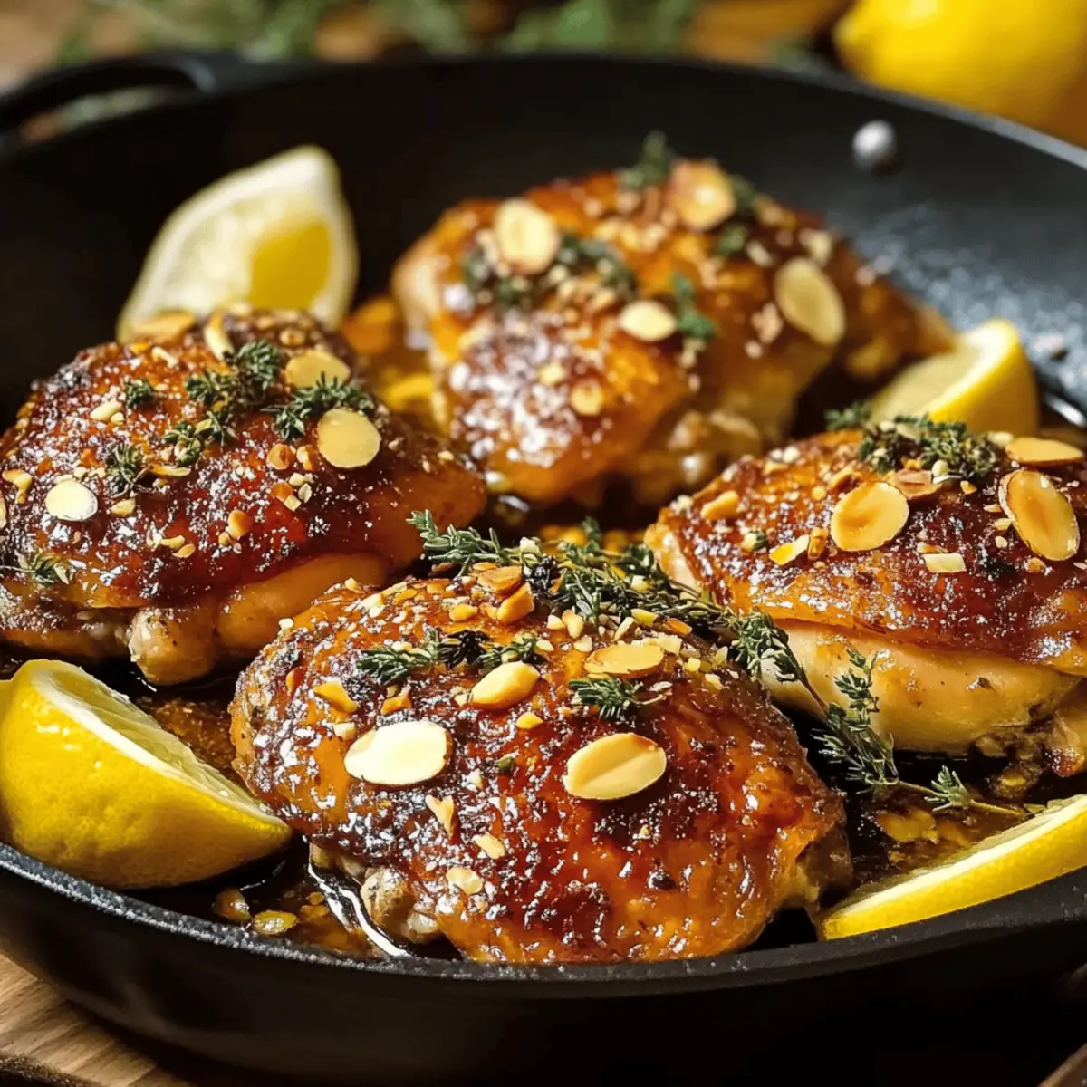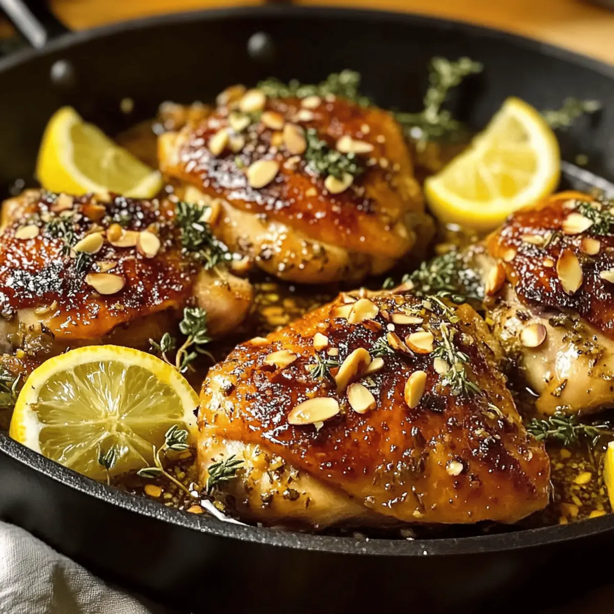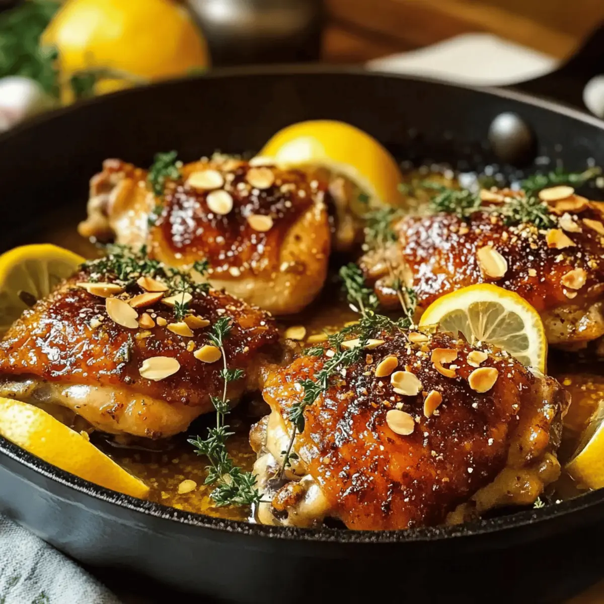 With a satisfying sizzle, my kitchen fills with the mouthwatering aroma of Skillet Lemon Herb Almond Chicken Thighs. This easy one-pan wonder captures the essence of home-cooked comfort with a delightful twist that keeps my family coming back for more. Succulent chicken thighs are golden brown and perfectly crispy, elevated by the zesty brightness of lemon and the earthy notes of fresh thyme. Plus, the crunchy toasted almonds add an irresistible crunch that transforms dinner into a memorable feast. Whether you’re short on time or just craving something delightful, this gluten-free, low-carb dish is a breeze to prepare and sure to impress. Ready to elevate your weeknight meals and leave takeout behind? Let’s dive into this delicious recipe that will make you feel like a gourmet chef at home! Why is this chicken dish a must-try? Unforgettable Flavor: The balance of zesty lemon and fragrant thyme immerses your taste buds in a delightful culinary experience. Crunchy Texture: Don’t miss the toasted almonds that add a satisfying crunch, making every bite unforgettable. One-Pan Ease: With minimal cleanup, this recipe fits perfectly into busy lifestyles, allowing you to spend more time enjoying your meal. Versatile Pairings: Serve it alongside creamy mashed potatoes or a crisp green salad for a well-rounded feast. For a complete dinner inspiration, check out my Butter Chicken Skillet or Lemon Herb Cod. Impress Your Guests: This gluten-free dish is sure to wow family and friends, transforming ordinary dinners into gourmet occasions. Get ready to love cooking again and leave the fast food behind! Skillet Lemon Herb Almond Chicken Thighs Ingredients For the Chicken • Chicken Thighs (bone-in, skin-on) – These are the backbone of the recipe, lending rich flavor and moisture; go organic for a fresher taste. • Salt & Black Pepper – Essential for enhancing all the flavors; season generously for the best results. For the Cooking • Olive Oil – Necessary for searing and achieving that perfect golden crust; avocado oil is a great substitution if you prefer a higher smoke point. • Garlic – Freshly minced adds depth to your dish; don’t skimp on this flavor booster! • Fresh Thyme – Brings earthy, aromatic notes to the table; dried thyme can substitute in a pinch, but use one-third of the amount. For the Sauce • Lemon – This bright and zesty ingredient is key for flavor; if you’re out of lemons, lime works beautifully too! • Honey or Maple Syrup – A touch of sweetness to balance the acidity in your sauce; agave syrup can be used for a vegan option. • Chicken Broth – Forms the savory base of your pan sauce; just ensure it’s gluten-free if that’s a concern. For the Crunch • Sliced Almonds – These provide that satisfying crunch; toast them for even more flavor or swap them out for sunflower seeds for nut-free fun. With these Skillet Lemon Herb Almond Chicken Thighs ingredients, you’re well on your way to whipping up a fabulous and memorable meal! Step‑by‑Step Instructions for Skillet Lemon Herb Almond Chicken Thighs Step 1: Preheat and Prep Begin by preheating your oven to 375°F (190°C) to ensure optimal cooking conditions for your Skillet Lemon Herb Almond Chicken Thighs. While the oven warms, pat the chicken thighs dry with paper towels. This is crucial for achieving perfectly crispy skin. Season both sides generously with salt and black pepper to enhance the flavors. Step 2: Heat the Skillet In a large, oven-safe skillet, pour in a couple of tablespoons of olive oil and heat over medium-high until shimmering—about 2-3 minutes. This hot oil is essential for searing the chicken thighs to golden perfection. Take a moment to admire the warmth of the oil, signaling that it’s time to add your chicken. Step 3: Sear the Chicken Carefully place the chicken thighs skin-side down in the skillet, ensuring not to overcrowd them. Allow the chicken to cook undisturbed for 8-10 minutes until the skin is beautifully golden brown and crackling. The sizzling sound and the mouthwatering aroma will let you know you’re on the right track! Step 4: Flip and Add Aromatics Once the skin is crispy, flip each thigh over to cook the other side. Immediately reduce the heat to medium and sprinkle minced garlic and fresh thyme into the pan. Sauté for 1-2 minutes until the garlic is fragrant and golden, enhancing the flavor profile of your Skillet Lemon Herb Almond Chicken Thighs. Step 5: Create the Sauce Squeeze fresh lemon juice over the chicken and pour in the chicken broth along with honey or maple syrup. Take a wooden spoon to deglaze the pan, scraping up any browned bits stuck to the bottom. This step adds depth and richness to the sauce, creating a flavor-packed base for your dish. Step 6: Add Lemon and Almonds Arrange lemon slices on top of the chicken thighs, followed by a sprinkle of sliced almonds. The almonds will provide that delightful crunch when baked. Make sure the lemon and almond toppings are evenly distributed for maximum flavor in every bite of your Skillet Lemon Herb Almond Chicken Thighs. Step 7: Bake to Perfection Carefully transfer the skillet to your preheated oven. Bake for 15-20 minutes or until the chicken reaches an internal temperature of 165°F (74°C). The sensation of the aroma wafting through your kitchen will be irresistible—a clear sign that dinner is nearing completion! Step 8: Rest Before Serving After baking, allow the chicken to rest in the pan for about 5 minutes. This resting period helps the juices redistribute, ensuring each bite of your Skillet Lemon Herb Almond Chicken Thighs is juicy and flavorful. Use this time to set the table and prepare your side dishes for a complete meal! What to Serve with Skillet Lemon Herb Almond Chicken Thighs Create a memorable dining experience by pairing these savory chicken thighs with delightful sides and drinks that highlight their flavors. Creamy Mashed Potatoes: The velvety texture of mashed pota