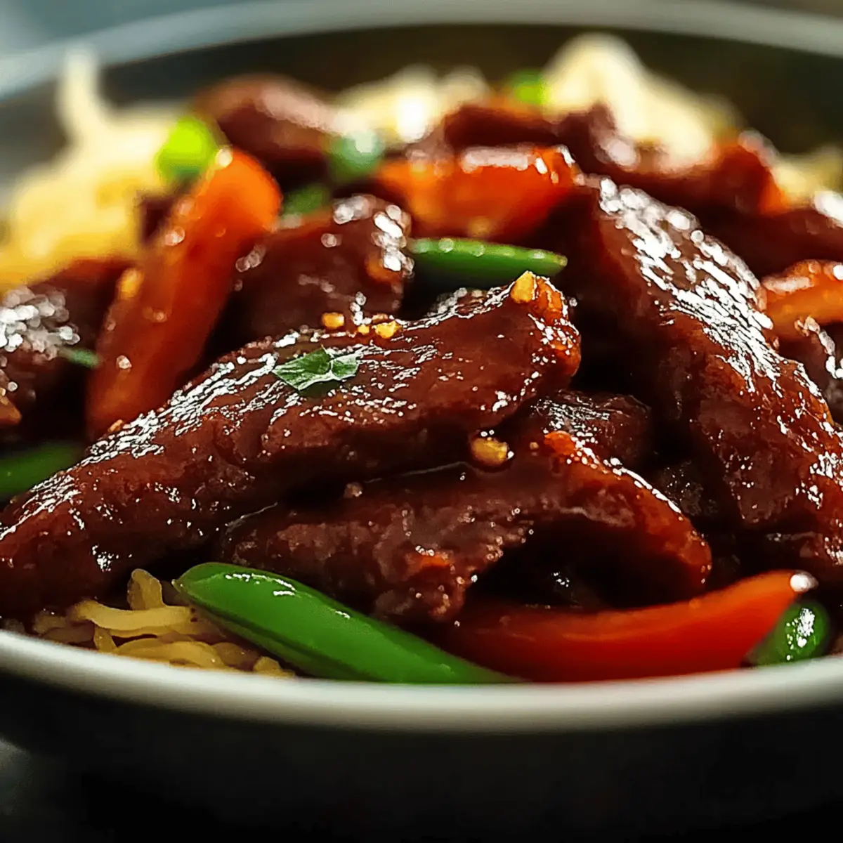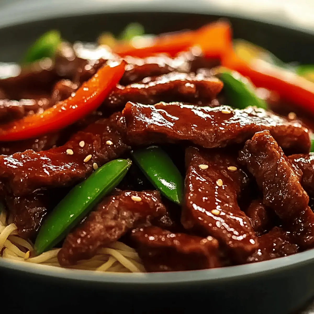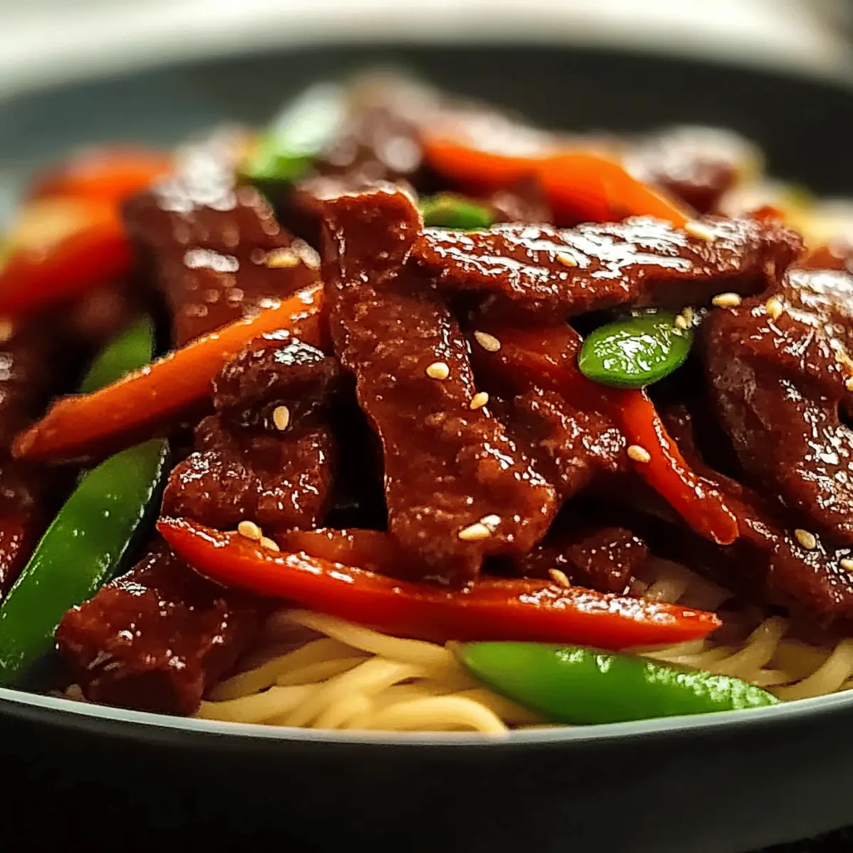 As I stood in my kitchen, the vibrant colors of fresh vegetables caught my eye—crisp bell peppers, green snap peas, and bright carrots just waiting to be transformed. That moment sparked the creation of my Sticky Rainbow Beef, a dish that brings life to any dinner table. This quick dinner not only dazzles with its kaleidoscope of colors but is also fully customizable to suit any palate. In just 20 minutes, you can whip up this nutritious Asian-inspired stir-fry that bursts with flavor and comfort, making it perfect for busy weeknights or when you crave something truly delightful. Ready to bring some color to your plate? Let’s dive in! Why Is Sticky Rainbow Beef So Special? Simplicity: This recipe is quick and easy, making it perfect for weeknight dinners, allowing you to whip it up in just 20 minutes. Customizable: Feel free to swap proteins or veggies to match your cravings—beef, shrimp, tofu, or whatever fresh produce you have on hand! Flavor Explosion: The savory-sweet glaze is a delightful balance of soy sauce, honey, and fresh aromatics that elevates every bite. Colorful Presentation: The visual appeal of this dish, with its mix of vibrant vegetables, makes it a feast for the eyes—perfect for family dinners or entertaining. Healthy Choice: Packed with nutrients and protein, this dish provides a wholesome, satisfying meal that doesn’t compromise on taste. Try serving this vibrant stir-fry over rice or noodles for a complete meal, or enjoy it on its own sprinkled with sesame seeds for a light yet satisfying option! Sticky Rainbow Beef Ingredients For the Beef • Beef Strips – A flavorful main protein; substitute with chicken, shrimp, or tofu for variety. For the Sauce • Soy Sauce – Adds umami and depth; try coconut aminos or tamari for a gluten-free option. • Honey – Balances the savory with sweetness; maple syrup or agave can be used as substitutes. • Cornstarch – Thickens the sauce; for low-carb options, you can substitute with xanthan gum or omit. For the Vegetables • Bell Peppers – Provide crunch and color; swap for zucchini or mushrooms based on availability. • Snap Peas – Add a fresh, crisp texture; baby corn makes a lovely alternative as well. • Carrots – Contribute sweetness; feel free to add other colorful veggies like broccoli or bok choy. For Aromatics • Garlic – Essential for a flavor boost; fresh is best for an aromatic punch! • Ginger – Enhances the dish with warmth; always opt for fresh for the richest taste. For Finishing Touches • Sesame Oil – Imparts a nutty aroma; drizzle it on just before serving for an extra layer of flavor. With these Sticky Rainbow Beef ingredients and a dash of creativity, you’ll create a wholesome, colorful meal that satisfies both the taste buds and the eyes! Step‑by‑Step Instructions for Sticky Rainbow Beef Step 1: Heat the Pan Begin by heating a wok or large skillet over high heat until it’s very hot, about 2-3 minutes. You want the surface to be smoking lightly, signaling it’s ready for cooking. This high temperature is crucial for achieving a perfect sear on the beef, ensuring it stays juicy and tender during the cooking process. Step 2: Prepare the Sauce In a small bowl, whisk together soy sauce, honey, vinegar, cornstarch, chili, and water until smooth—this takes about 1-2 minutes. Once mixed, set the sauce aside, allowing the flavors to meld. You’ll notice a thick, glossy texture, which will coat the Sticky Rainbow Beef beautifully once it’s added later in the cooking process. Step 3: Sear the Beef Add a splash of oil to the hot pan, and then carefully place the sliced beef into the oil. Sear for 2-3 minutes, allowing it to brown nicely on all sides. You’ll see the edges caramelize, giving a deliciously rich flavor; then, remove the beef from the pan and set it aside to keep it tender and juicy. Step 4: Stir-Fry the Vegetables In the same pan, toss in the minced garlic and ginger, stirring for about 30 seconds until fragrant. Next, add your vibrant vegetables—such as bell peppers, snap peas, and carrots—stir-frying for 2-3 minutes until they are crisp-tender. They should retain their colors and crunch, creating that appealing look in your Sticky Rainbow Beef. Step 5: Combine All Elements Return the seared beef to the pan along with the prepared sauce. Stir continuously for about 2-3 minutes until the sauce thickens and coats the beef and vegetables evenly. You’ll know it’s ready when the sauce is glossy and clings beautifully to everything, turning the dish into a mouthwatering, cohesive stir-fry. Step 6: Add Finishing Touches Finally, drizzle the stir-fry with sesame oil and toss everything together for about 30 seconds. This adds a rich, nutty aroma to the Sticky Rainbow Beef. Top with sliced spring onions for an extra pop of color and serve immediately, enjoying the delightful mix of flavors and textures. Storage Tips for Sticky Rainbow Beef Fridge: Store any leftovers in an airtight container in the fridge for up to 3 days. Keeping it sealed helps maintain the flavor and texture of your delicious Sticky Rainbow Beef. Freezer: If you want to keep it longer, freeze the stir-fry in a freezer-safe container for up to 2 months. Just make sure the dish cools completely before sealing to avoid freezer burn. Reheating: To reheat, thaw overnight in the fridge if frozen, then microwave or heat in a skillet over low heat until warmed through, adding a splash of water or broth to revive the sauce. Enjoy Immediately: Though you can store or freeze, this dish is best enjoyed fresh to truly savor the crunchy vegetables and tender beef that make Sticky Rainbow Beef so enticing! What to Serve with Sticky Rainbow Beef The vibrant flavors and stunning colors of this dish inspire the perfect pairing for a delightful feast. Steamed Jasmine Rice: Fluffy rice acts as the ideal base to soak up the flavorful sticky sauce, making each bite satisfying. Garlic Noodles: Rich and buttery
