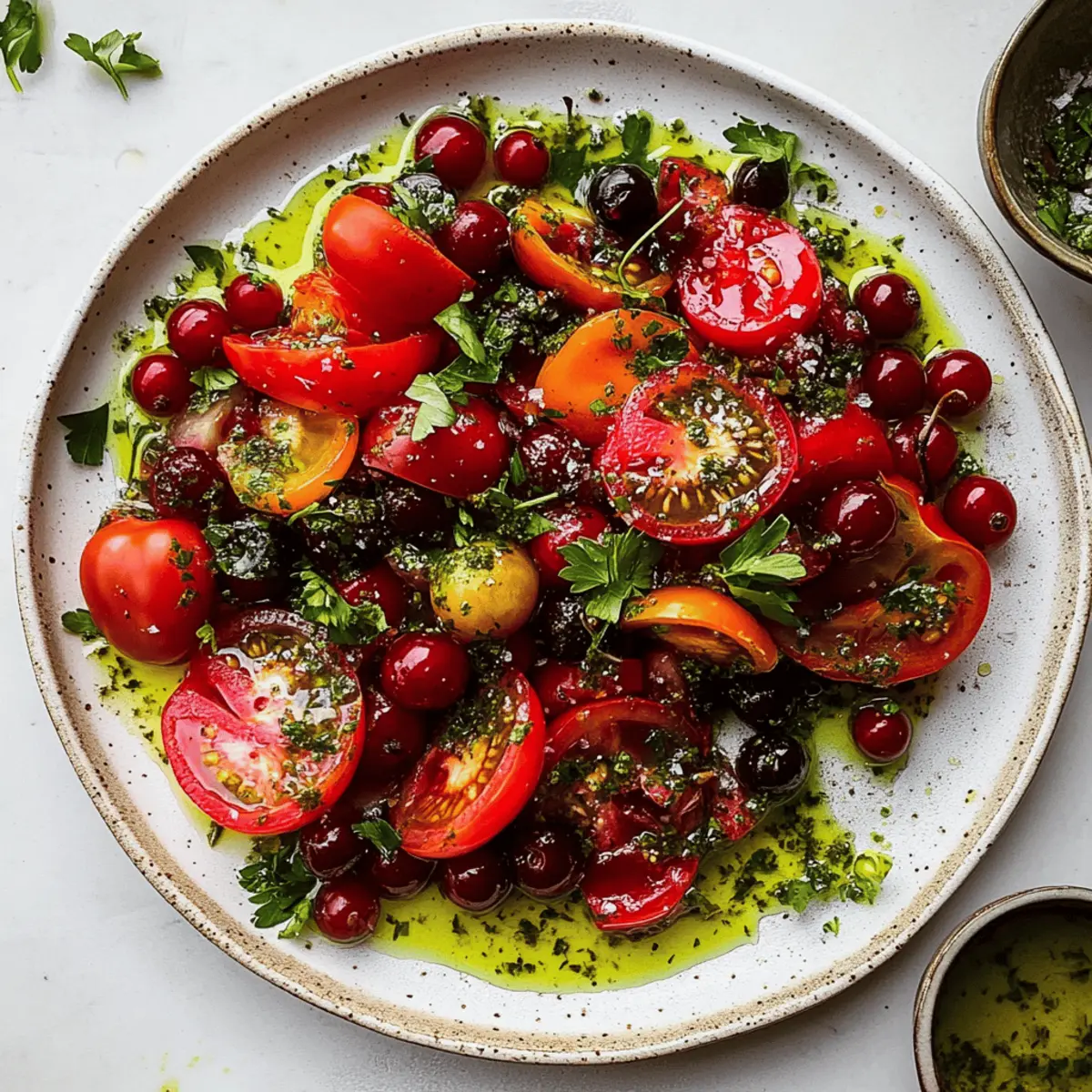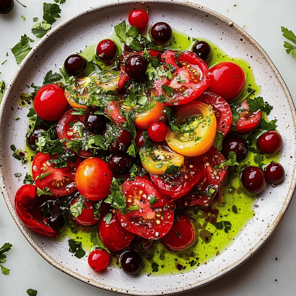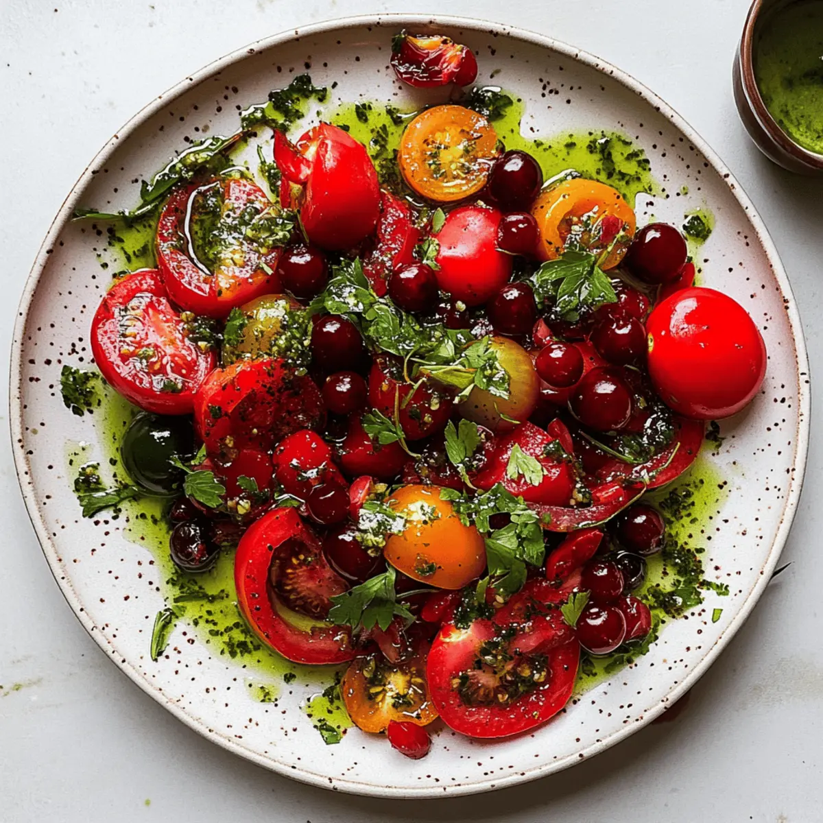 As I stood in the kitchen, the sun pouring through the windows, the scent of ripe heirloom tomatoes made me smile. There’s something magical about summer produce, and today, I’m excited to share my Summer Tomato Salad with Serrano Chili Oil, enriched with sweet currants, tangy cherries, and fresh herbs. Not only is this vibrant dish a celebration of seasonal flavors, but it’s also plant-based and gluten-free, making it a guilt-free indulgence for those of us looking to escape the routine of fast food. Whether you’re prepping for a weekend barbecue or a cozy evening at home, this salad serves as a refreshing side or a light lunch option that’s sure to impress. Are you ready to elevate your summer dining experience with this delightful combination? Why is this salad a must-try? Freshness Redefined: This Summer Tomato Salad with Serrano Chili Oil bursts with ripe flavors, making it a true representation of seasonal eating. Sweet and Spicy: The contrast of sweet currants and cherries with the heat of serrano chili oil creates a delightful explosion of taste in every bite. Easy Preparation: Whipping up this vibrant dish is a breeze, requiring minimal cooking—all the more reason to leave fast food behind! Versatile Pairing: Pair it with grilled fish or chicken for a delightful meal, or enjoy it as a stand-alone dish for lunch. It’s a true crowd-pleaser! Nutrient-Packed: This salad is not only delicious but also high in vitamins and antioxidants, proving that eating healthy can be enjoyable. Don’t forget to check out my recipes for Avocado Chicken Salad or Savory Baked Herbs for more ideas to complement your meals! Summer Tomato Salad Ingredients • Get ready to create a burst of flavor! For the Salad Heirloom Tomatoes – A variety of heirloom tomatoes provides natural sweetness and juiciness for the salad’s base. Fresh Currants – These little gems add a delightful pop of sweetness; if you’re out, raisins work too! Cherries (pitted and halved) – Their sweet-tart flavor enhances the dish, but feel free to swap in seasonal peaches or plums. Lemon Juice and Zest – A splash of fresh lemon brightens everything up; always choose fresh for optimal taste! Basil Leaves – Fresh basil adds aromatic flavor that elevates the salad—dried basil just won’t do. Dill (chopped) – The herbal notes of dill offer freshness; if you’re not a fan, parsley makes a great substitute. Cilantro (chopped) – Adds complexity to the flavor; if you prefer not to use it, parsley is a solid choice. For the Serrano Chili Oil Serrano Chili – This chili brings the heat; if you want it milder, jalapeño works just as well. Flaky Sea Salt – Perfect for enhancing all the flavors in the salad; regular salt can be replaced—just adjust to taste. Fresh Ground Pepper – Adds a lovely depth of flavor that’s mildly spicy and complements the sweetness. With these vibrant ingredients for your Summer Tomato Salad with Serrano Chili Oil, you’re on your way to a sensational dish that celebrates all the flavors of summer! Step‑by‑Step Instructions for Summer Tomato Salad with Spicy Serrano Chili Oil Step 1: Combine the Salad Ingredients In a large mixing bowl, gently combine the ripe heirloom tomatoes, fresh currants, and halved cherries. Then, squeeze in the fresh lemon juice and add the zest, along with half of the chopped basil, dill, and cilantro. Toss everything together lightly, ensuring all ingredients are well coated and evenly distributed for the best flavor in your Summer Tomato Salad. Step 2: Let the Flavors Meld Cover the bowl with plastic wrap and allow the salad mixture to sit at room temperature for about 30 minutes. This resting period not only helps the flavors blend beautifully but also encourages the tomatoes to release their natural juices, creating a delicious sauce that adds moisture and taste to the salad. Step 3: Prepare the Serrano Chili Oil While the salad is resting, heat ½ cup of olive oil in a small saucepan over low heat. Carefully add the sliced serrano chili and 1 teaspoon of coriander seeds, letting them infuse slowly for about 10 minutes. Keep an eye on the oil to ensure it doesn’t get too hot—you’re aiming for a gentle simmer that allows the flavors to meld without burning. Step 4: Blend the Chili Oil Once the oil has infused, carefully remove it from heat and allow it to cool slightly. Transfer the warm chili oil mixture to a blender and puree until smooth and vibrant. This process will give you a beautifully green serrano chili oil that’s packed with flavor, perfect for drizzling over your Summer Tomato Salad. Step 5: Assemble and Serve the Salad After the salad has rested, transfer it to a serving platter or individual bowls. Garnish with the remaining fresh herbs, additional sliced serrano chili for extra heat, and drizzle generously with the homemade serrano chili oil. Finish by seasoning with flaky sea salt and freshly ground pepper to taste, enhancing the delicious layers of flavor in your summer delight. Expert Tips for Summer Tomato Salad Choose Fresh Tomatoes: Always opt for ripe heirloom tomatoes; they’re sweeter and juicier, ensuring your Summer Tomato Salad shines with flavor. Mix and Match Fruits: Feel free to experiment with seasonal fruits—swap cherries for peaches or plums, adding your personal touch to the salad. Let It Rest: Allow the salad to sit for at least 30 minutes to truly meld the flavors and enhance the taste experience in your Summer Tomato Salad. Control the Heat: Adjust the heat level of your serrano chili oil by deciding how many seeds to remove; this small step can significantly change the spice level. Safety First: When blending hot chili oil, use a dish towel over the blender lid to prevent splatters and keep your kitchen tidy. Garnish Wisely: Don’t skimp on fresh herbs when serving; they add pops of color and elevate the aroma, making your salad irresistible! What to Serve with Summer Tomato Salad with Spicy Se