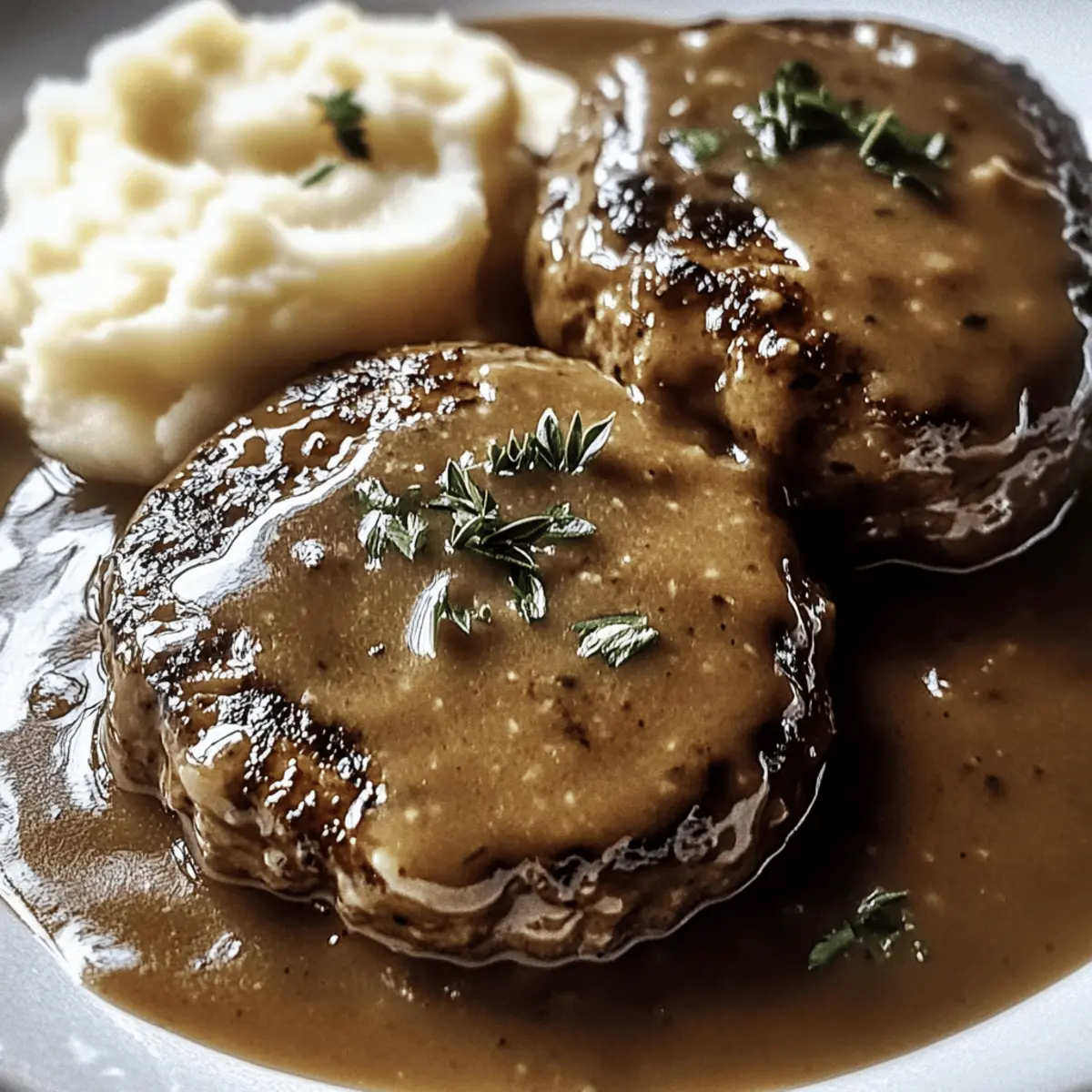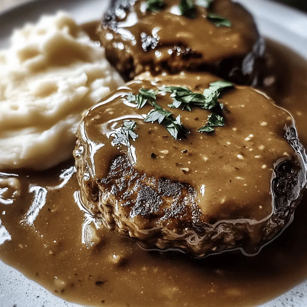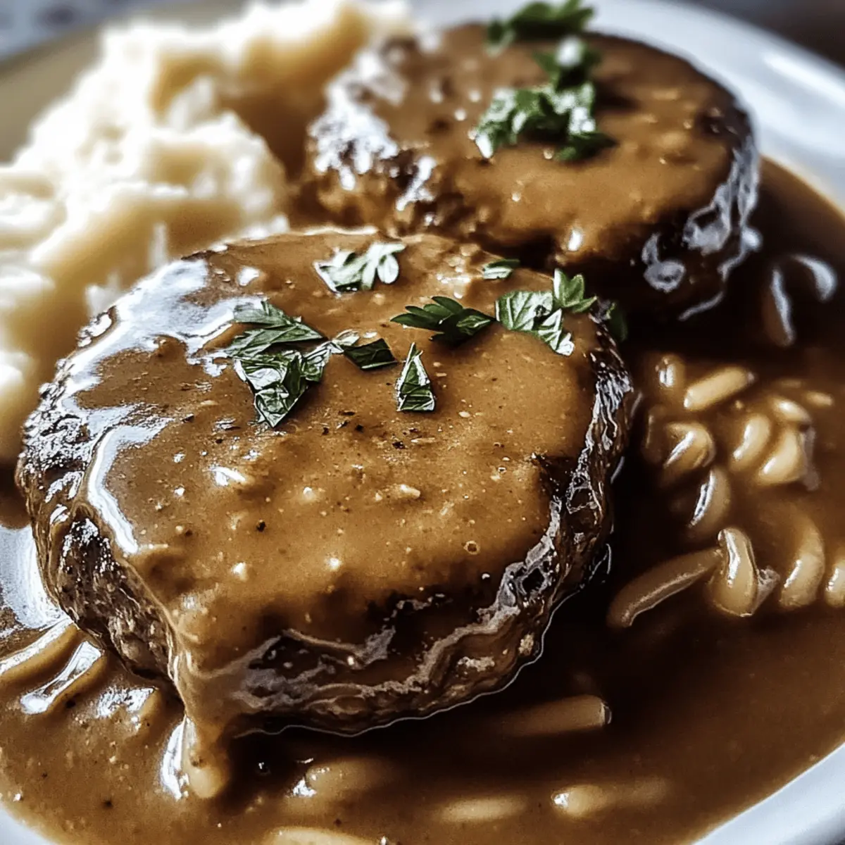 As the sun sets and the chill of the evening creeps in, there’s something irresistibly comforting about a slow-cooked dinner that fills the kitchen with warmth. Enter my Tender Salisbury Steak in Rich Gravy—a dish that promises melt-in-your-mouth satisfaction with minimal prep time. This family-friendly recipe is ideal for those restless weeknights when you crave something hearty and soul-nourishing. The best part? It’s completely customizable, allowing you to add your favorite flavors or even swap ingredients to cater to dietary preferences. Rich in flavor and easy to make ahead, this Salisbury steak will soon become a go-to meal for your loved ones. What flavor twist will you add to make it your own? Why is Tender Salisbury Steak So Irresistible? Comforting, Soul-Warming: There’s nothing quite like the cozy vibes of this meal as it simmers. Effortless Preparation: With just a few basic steps, anyone can serve up a delicious dinner. Flavor-Bursting Gravy: The rich and savory gravy elevates the patties, making every bite memorable. Versatile Customization: Feel free to swap in your favorite veggies or proteins! This recipe aligns beautifully with meals like Pepper Steak Bell and can even be tailored to a vegetarian option. Family-Friendly Delight: Perfect for gatherings, it’ll earn you praise from every guest at the table. Get ready to have your culinary skills celebrated! Tender Salisbury Steak Ingredients • Discover the flavorful components that make this dish a comfort food classic! For the Patties 80% Lean Ground Beef – This main protein source ensures juicy patties; consider using 85% lean for a slightly healthier option. Onion Soup Mix – Adds rich flavor conveniently; replace with blended dried onions and seasonings if desired. Olive Oil – For browning the beef patties, enhancing flavor; use vegetable oil if preferred. For the Gravy Condensed Beef Broth – Essential for the base of the gravy; opt for low-sodium for a healthier choice. Water – Adjusts the consistency of the gravy, vital for simmering. Worcestershire Sauce – Provides depth and richness; a gluten-free version works as a substitution. Cornstarch – Thickens the gravy to create a hearty texture; mix with cold water to form a slurry. For the Aromatics Onion – Fresh flavor base that enhances aroma and taste. Garlic – Complements onions beautifully and adds depth; in a pinch, use garlic powder. Mushrooms – Introduces earthy flavors; fresh mushrooms are best; you can replace half the beef for a vegetarian twist. Let the magic of the Tender Salisbury Steak begin! 🌟 Step‑by‑Step Instructions for Tender Salisbury Steak Step 1: Brown the Patties Heat 2 tablespoons of olive oil in a large skillet over medium heat. Once the oil is shimmering, carefully add the seasoned beef patties. Brown them for about 2 minutes on each side until they develop a golden crust. This step enhances the flavor of your Tender Salisbury Steak, so ensure they are well-seared before setting them aside. Step 2: Sauté the Vegetables In the same skillet, add the sliced onions and minced garlic, sautéing for approximately 3 minutes until they become fragrant and begin to soften. Next, toss in the sliced mushrooms and continue to cook for an additional 5 minutes, allowing them to release their moisture and develop a rich flavor that complements the Salisbury steak. Step 3: Combine and Simmer Stir in 2 tablespoons of Worcestershire sauce along with 1 can of condensed beef broth and 1 cup of water. Bring the mixture to a gentle simmer, allowing it to bubble lightly for about 5 minutes. This will create a flavorful gravy base that will envelop your patties, making every bite of the Tender Salisbury Steak bursting with taste. Step 4: Transfer to Slow Cooker Carefully place the browned patties into the slow cooker, ensuring they are evenly spaced. Pour the sautéed vegetable mixture over the patties, covering them well. Secure the lid and set your slow cooker to low, letting the Salisbury Steak cook for 6-7 hours. This slow-cooking process will tenderize the beef and meld the flavors beautifully. Step 5: Thicken the Gravy After the cooking time is complete, prepare a cornstarch slurry by mixing 2 tablespoons of cornstarch with 2 tablespoons of cold water in a small bowl. Stir this mixture into the slow cooker with the Salisbury steak, ensuring even distribution. Allow it to cook for an additional 30 minutes, during which the gravy will thicken to a hearty consistency that perfectly accompanies the beef. What to Serve with Tender Salisbury Steak in Rich Gravy As the comforting aroma wafts through your home, you’re likely dreaming of the perfect accompaniments to elevate your meal. Creamy Mashed Potatoes: The velvety texture pairs beautifully with the rich gravy, perfect for soaking up every drop. It’s a classic comfort that never disappoints. Steamed Green Beans: Fresh, crisp green beans bring a delightful crunch that contrasts the tender steak, adding a pop of color to your plate. Buttered Egg Noodles: Simple yet satisfying, these noodles provide a soft base for the gravy, making for a hearty bite. Each forkful offers a cozy embrace of flavor. Crispy Garlic Bread: Essential for sopping up extra gravy, this side adds a delightful crunch and aromatic garlic flavor to your meal. It’s a must-have for bread lovers! Roasted Brussels Sprouts: Their earthy flavor and crispy exterior not only complement the richness of the steak but also add nutritional value and a touch of sophistication. Mixed Green Salad: A light and refreshing salad drizzled with a tangy vinaigrette introduces brightness and balances the meal’s richness perfectly. Red Wine: Pairing with a smooth red wine enhances the savory flavors of the steak, making the experience even more indulgent and warm. Chocolate Cake: For dessert, a rich chocolate cake offers a sweet ending to the comforting flavors of your meal—a perfect harmony between savory and sweet. Make